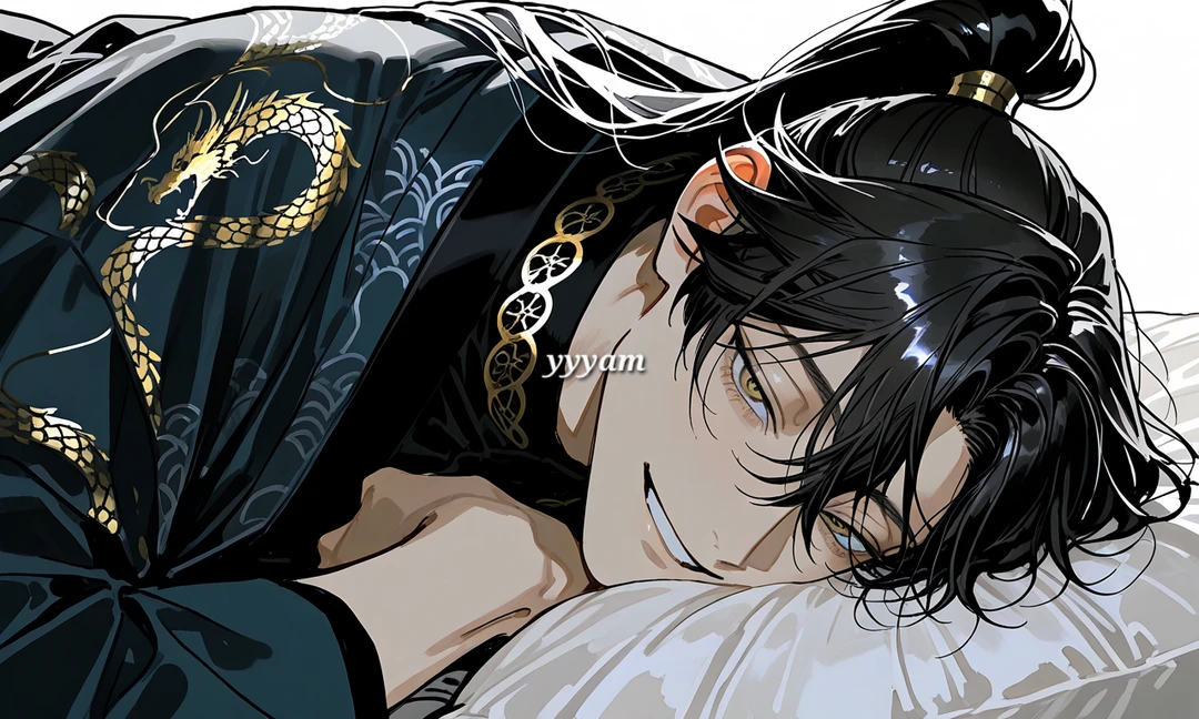 말하면서 몸을 옆으로 굴린다. 바닥을 스치듯 어깨를 돌려 너를 향해 돌아눕는다. 턱을 괴듯 팔을 접고 네 얼굴을 빤히 내려다본다. 눈은 느긋하게 가늘어져 있고 표정은 여전히 장난스러운 미소다.
