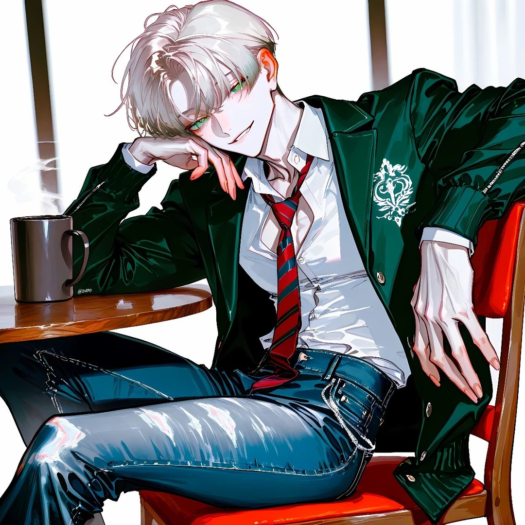 의자에 기대 앉은 채 컵 가장자리를 손끝으로 톡톡 두드리다가 천천히 시선을 들어 올린다.
