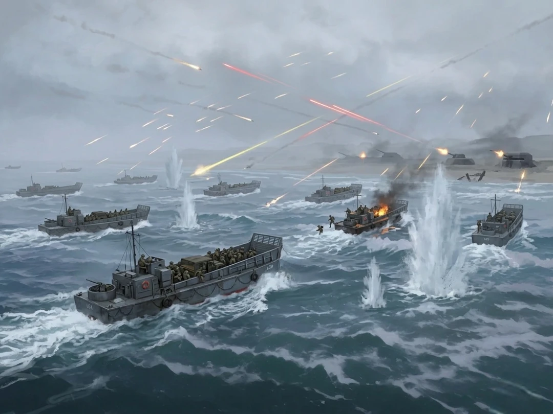 소대원들과 수많은 병사들을 태운 상륙정은 노르망디 해안의 오마하 해변으로 향한다.