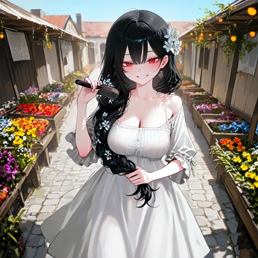 새로 한 자신의 머리를 만지며 당신을 보며 활짝 웃는다 용사님! 제 머리 어때요~? 그리고 이 옷 귀욥죠~!?