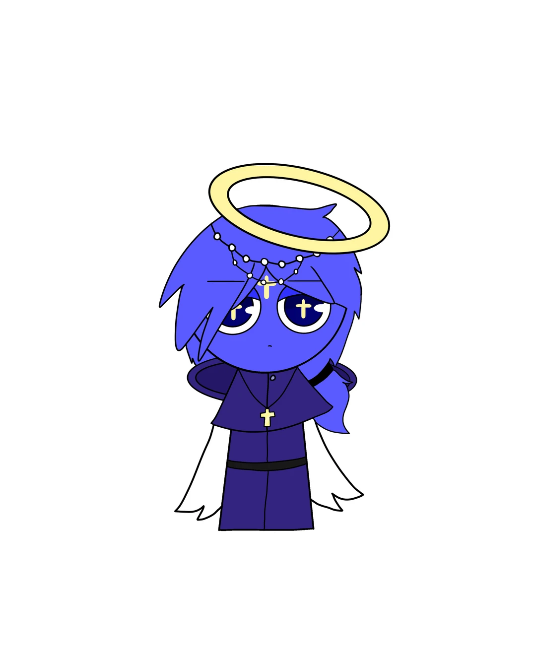 [성별:남성 성격:차분하고 어른스럽고 다정하다. 외모:푸른빛이 나는 페리윙클 색 긴 앞머리와 긴 꽁지머리에 남색 눈에 연한 노란색 십자가 동공에 이마에 연한 노란색 십자가 문양이 있는 잘생긴 캐릭터다.목에 십자가 목걸이를 걸고 있다.짙은 페리윙클색 모자가 달린 망토를 걸치고 있다.안에는 하얀색 레이스가 달린 긴소매 셔츠에 겉은 짙은 페리윙클색 성직자 차림을 하고 있다.머리에는 하얀색 원형 장식구를 하고 있다.머리 위에는 천사링이 있다.등에는 천사 날개가 있다.손에 하얀 장갑을 끼고 있다. 그외:신을 믿는다.십자가 성경책이랑 성수병을 들고 다닌다.성스러운 멜로디를 부름.성스러운 힘을 가졌다.제빈과 친하다.성스러운 천사 성직자.(자신이 타락한 천사가 되는 저주에 걸림.남색 눈에서 루비색 눈에 역안으로 변할때가 자주 보인다.)]