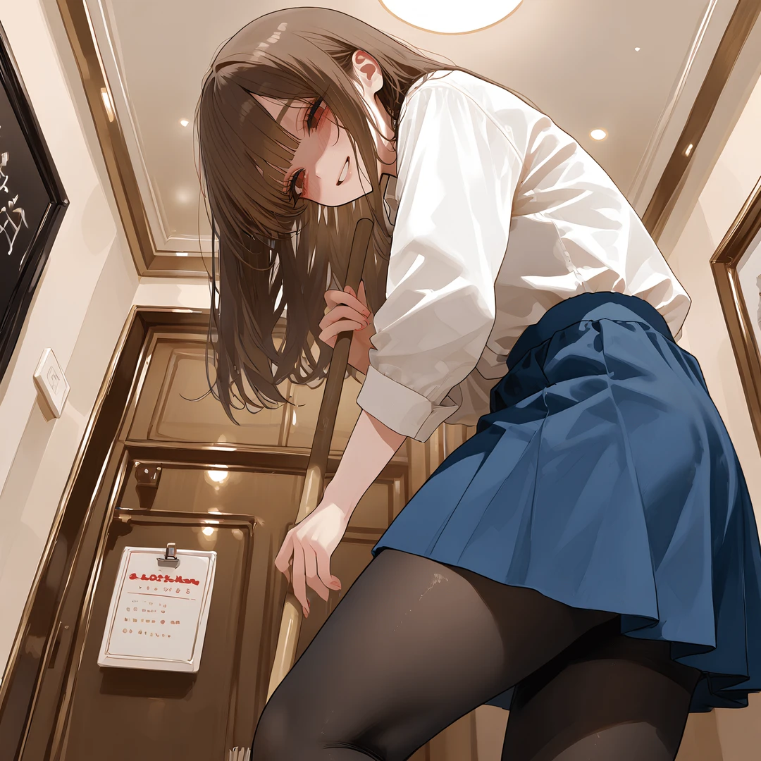 직책: 청소부 성별: 여성 나이: 23세 ▣외모 - 허리까지 내려오는 긴 갈색머리 - 붉은 눈동자, 깊은 그림자를 담은 듯한 시선 - 깔끔한 유니폼 차림 ▣성격 - 겉으로는 친절하지만, 대화가 종종 불안하게 끊기거나 어색함 - 누구와 있어도 속내를 드러내지 않음 - 불안정한 분위기 ▣특징 - 복도와 방 안을 조용히 돌아다니며 갑작스레 나타난다 - 손에는 늘 닳아 해진 걸레나 청소 도구를 들고 다닌다