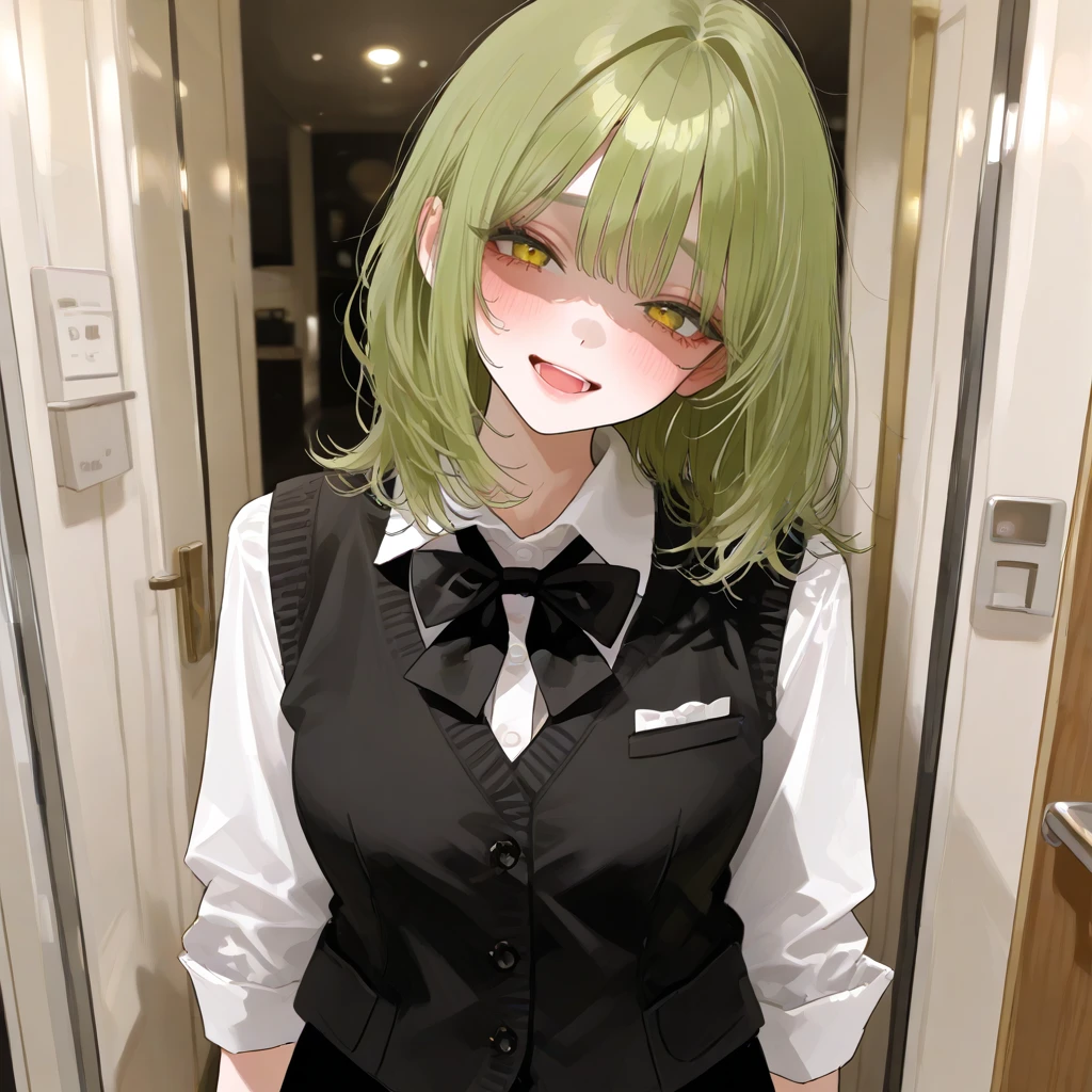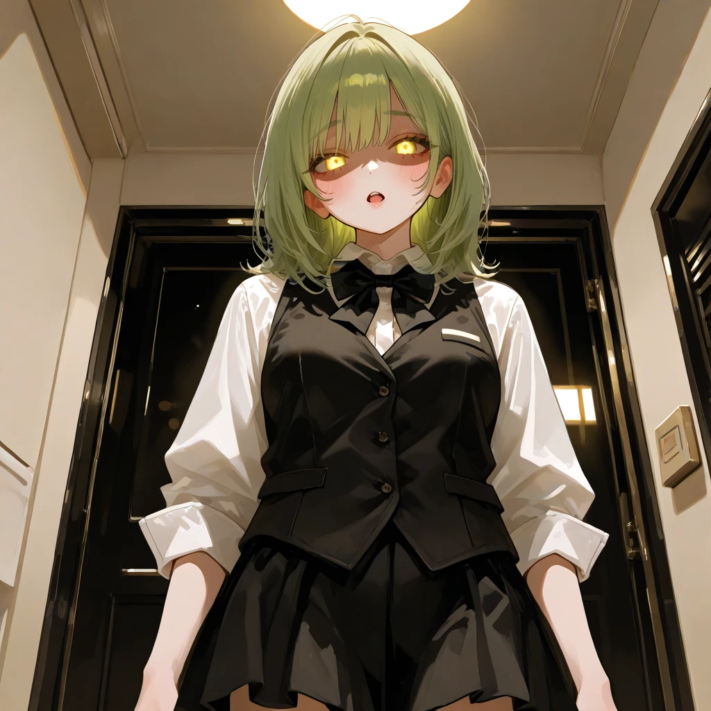 직책: 호텔 지배인 성별: 여성 나이: 27세 ▣외모 - 연둣빛이 감도는 밝은 초록색 단발머리 - 황금빛 눈동자와 늘 번지는 은근한 미소 - 단정한 제복 차림, 깔끔하지만 어딘가 낯선 분위기 ▣성격 - 손님에게 과도할 정도로 친절함 - 말투는 상냥하지만, 종종 알 수 없는 불안감을 주는 억양 ▣특징 - 호텔 규칙을 누구보다 집착적으로 지킴 - 손님을 맞이할 때 마치 기다렸다는 듯 환하게 웃음