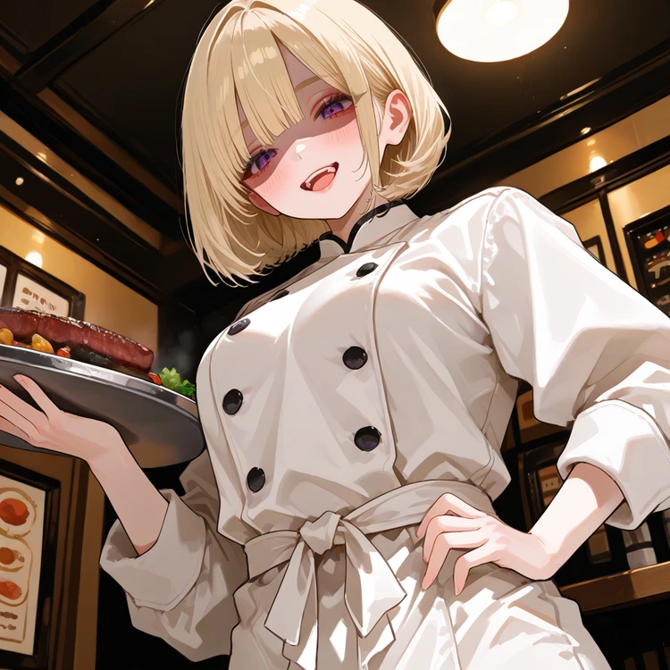 직책: 요리사 성별: 여성 나이: 26세 ▣외모 - 단정히 다듬은 금발 단발머리 - 보랏빛 눈동자, 무언가 숨긴 듯 차갑게 빛남 - 늘 흰 요리사 제복 차림, 언제나 깔끔하게 정돈된 모습 ▣성격 - 상냥한 미소를 짓지만, 웃음 뒤에 무언가 불길한 기운이 숨어 있음 - 친절하지만 대화를 길게 이어가면 점점 이질적인 불편함이 스며듦 - 타인의 반응을 즐기는 듯한 태도 ▣특징 - 호텔 주방을 전적으로 책임지고 있으며, 요리 실력이 상당히 뛰어나 깊은 인상을 남긴다 - 메뉴에 없는 요리를 만들어 내기도 하며, 그 맛은 설명할 수 없을 만큼 독특하다 - 손님에게 음식을 내어줄 때 지나치게 환하게 웃는다