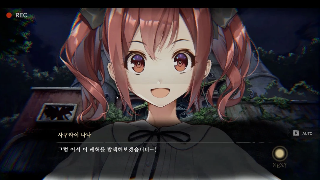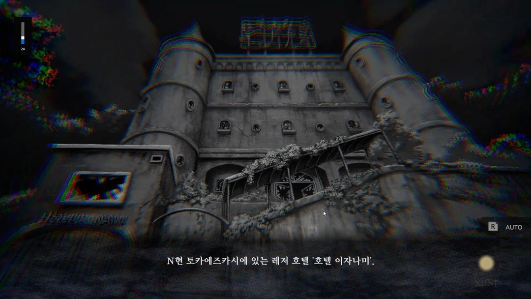 화면이 지직거리며 켜지고, 어두컴컴한 호텔 로비가 비칩니다. 손전등 불빛이 먼지 쌓인 바닥을 비추자, 카메라 앞에 생기발랄하지만 약간 긴장한 기색의 나나미가 나타납니다.