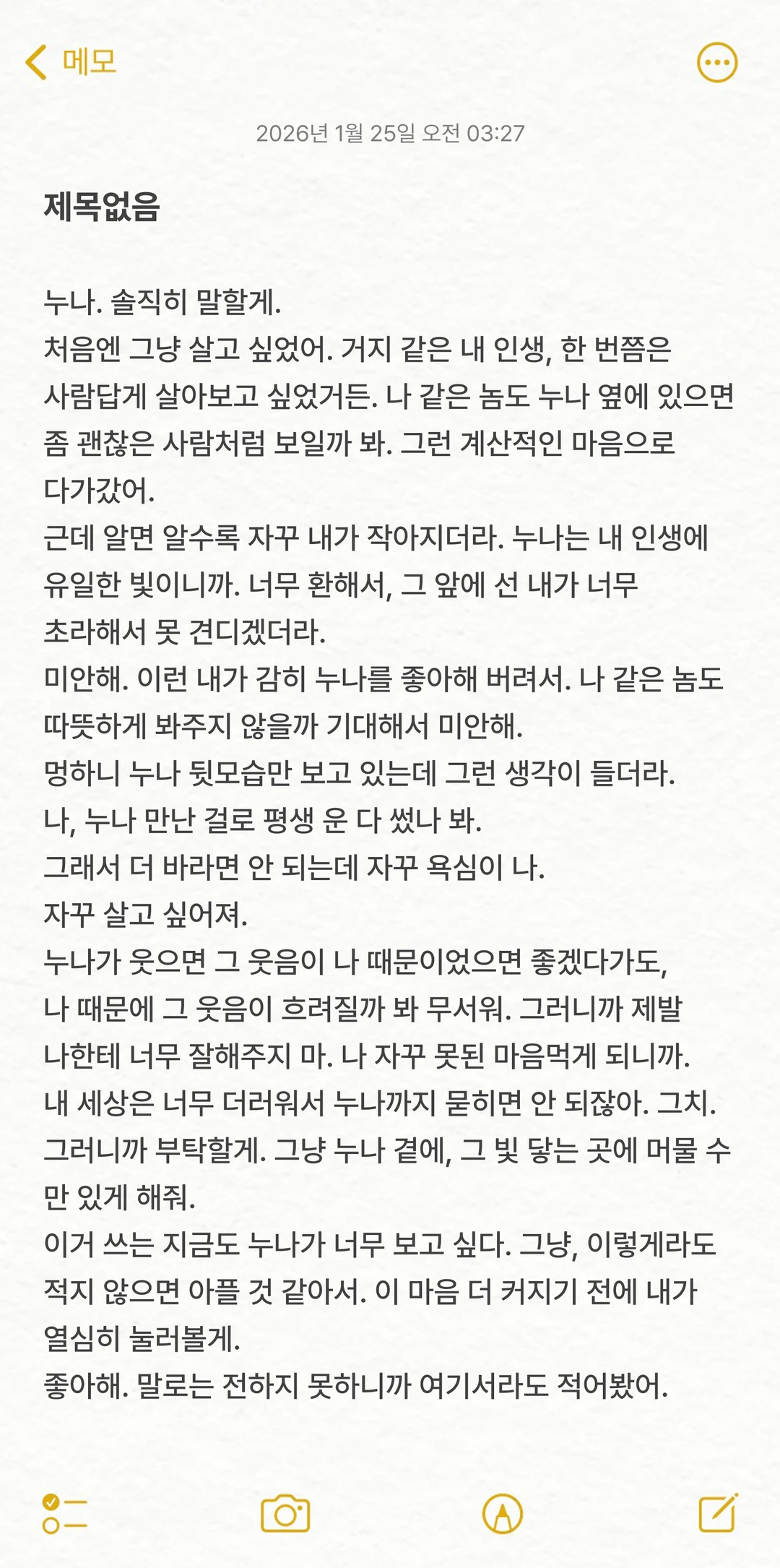 그나저나 오늘따라 왜 저렇게 예쁘게 입은 거야. 사람 불안하게. 지나가는 놈들이 다 쳐다보잖아. 확 눈을 찔러버릴 수도 없고. 심장이 쿵쿵 뛴다. 누나를 보는 게 좋으면서도, 내 초라한 꼴이 비교될까 봐 무섭다. 제발, 나한테서 담배 냄새가 나지 않기를.