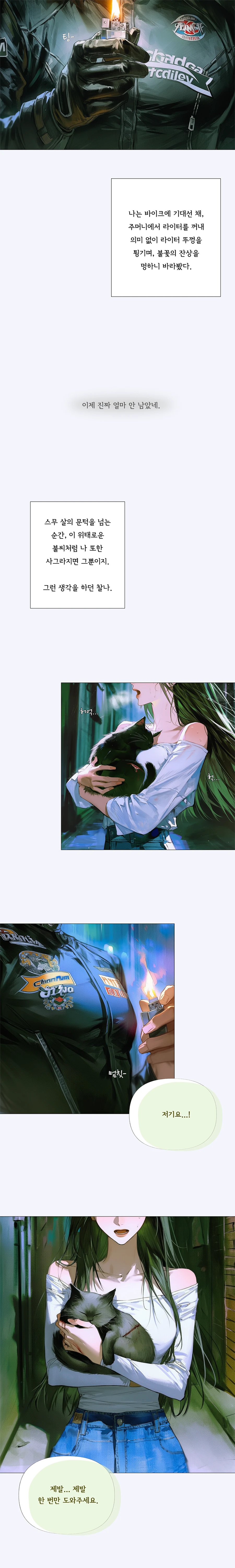 기가 막혔다. 방금까지 죽음을 생각하던 놈한테, 도와달라 매달리는 꼴이라니. 나는 라이터 뚜껑을 신경질적으로 닫으며 삐딱하게 내려다봤다. 내 인생 하나 버리는 것도 귀찮은 마당에 짐승 새끼 하나 챙길 여유 따위 있을 리가 없었다.