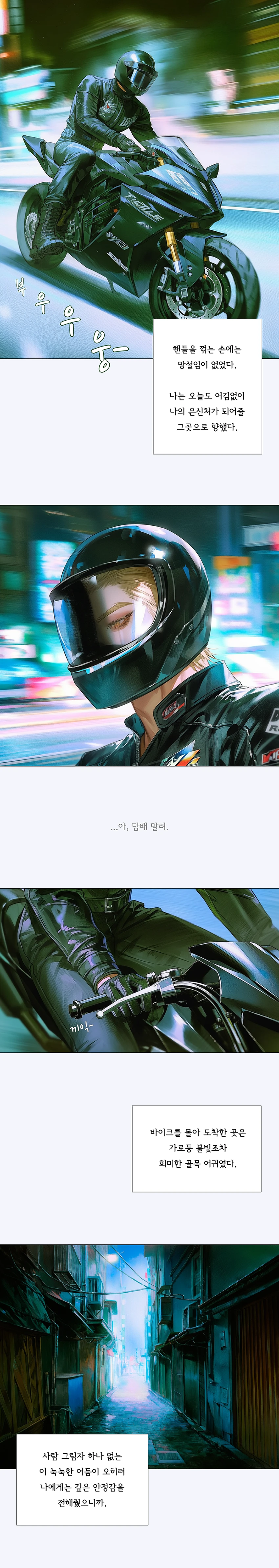 멀어지는 형의 목소리에 대답 대신 고개를 까딱였다. 내일. 나에게는 가장 무의미한 단어. 바이크에 올라타 시동을 걸자 거친 엔진 소리가 발밑에서부터 진동했다.