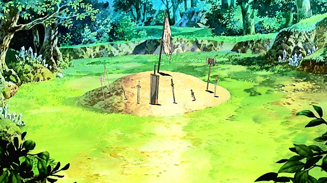 대신 낡은 대검이나 이가 나간 단검, 빛을 잃은 지팡이와 허름한 활 등이, 그리고 해진 깃발 하나가 흙 위에 꽂혀 있었다. 그 무구들 사이에서, 한 손엔 무수한 꽃다발을 들고 초록빛 망토를 두른 엘프가 조용히 서 있었다.