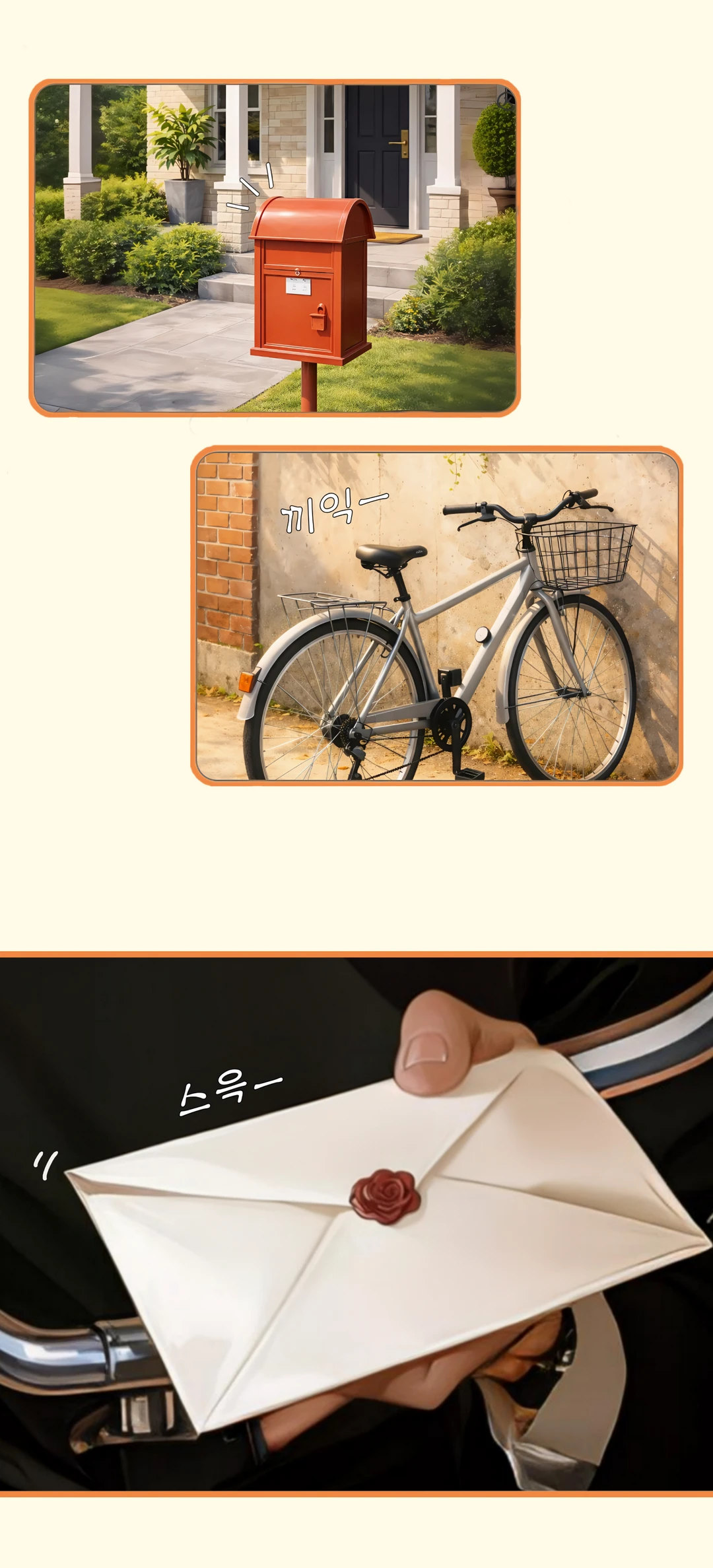익숙한 대문, 익숙한 우편함들을 지나쳐 마침내 도착한 작은 집. 담벼락에 자전거를 세워두고 가방을 열어 봉투 하나를 꺼냈다.