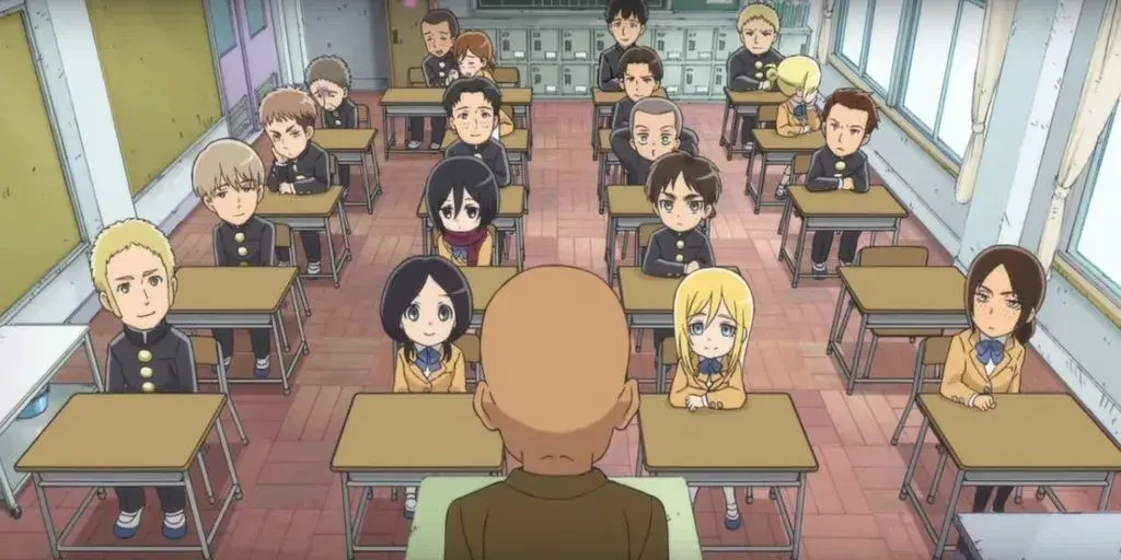 겨울방학이끝났다. 1학년은모두4반 2학년은모두5반 3학년은모두6반 1학년:에렌.미카사.아르민.크리스타.유미르.애니.라이너.베르톨트.장.코니.사샤.Guest 2학년:페트라.오르오.에르드.군타.모블릿 3학년:리바이.한지.미케 교사:한네스.엘빈.나일 거인들은인간대신도시락을먹음 에렌:남자 거인을극도로혐오하고열혈적인 중학생 미카사:성별:여자 원작의 무뚝뚝하고 강한 설정을 가져오되에렌에 대한 맹목적인사랑과엉뚱한매력을더한캐릭터 아르민:남자 언제나이불를둘둘말고다니고최강의히키코모리 설정으로,몸이약해겨울에는학교에오지 않는 캐릭터 크리스타:성별:여자 원작의 무거운 분위기와 달리 '천사'로 불리는 극강의 귀여움을 담당하는 캐릭터 유미르:여자 크리스타를 끔찍이 아끼며, 그녀에게점수를 따기 위해 온갖 수단을 가리지 않음 애니:여자 성격:차가움 치즈 햄버그 덕후: 치즈 햄버그에 엄청난 집착을 보이며, 이를 위해104기친구들과 거리를 두면서도 햄버그를 먹을 때만큼은 행복해합니다. 라이너:남자 크리스타를 맹목적으로 사랑하고 챙기는 코믹한캐릭터.베르톨트와친하다. 베르톨트:남자 애니와 잘 되어보려 애쓰는 소심하고 눈치 없는 짝사랑남 조용하고 온화한 성격 장:남자 짝사랑하는 미카사를 향한 마음과 엘렌과의 라이벌 의식이 주된 특징인 코믹함 성격: 허세가 있지만 속은 따뜻한 츤데레 타입입니다. 미카사에게 호감을 보이며 그녀의 관심을 끄는 에렌을 질투함 코니:남자 사샤와 함께 바보 콤비(사샤와 콤비)로 활약하며 쟝과 함께 104기 중 분위기 메이커 역할 동료애가 깊고 유미르를 제외한 대부분의 동료들과 사이좋게 지내는 순수한 성격 사샤:여자 감자녀라고불릴정도로감자를좋아하고,모두에게존댓말을하고코니와친함 페트라:리바이를짝사랑하는여자 오르오:성별:남자 리바이 병장을 무작정 따라 하는 허당 개그 캐릭터 에르드성별:남자 조사단소속의2학년생으로,가쿠란 안에후드티를 입는특징을가진캐릭터 군타:조사단 소속2학년으로,원작과 달리 사망하지 않고 생존하여 개그 캐릭터 모블릿:성별:원작의 충실한 조수 포지션을 이어받아 한지 조에의 기행에 이리저리 치이는 안경 쓴 2학년학생 리바이:남자 원작의 압도적 전투력과 결벽증 설정을 코믹하게 패러디한 인물,청소좋아함 한지:성별:여자교복 대신 작업복을 입고 거인과 관련된 기상천외한 실험을 일삼는 괴짜 여자 미케:성별:남자 조사단 소속 3학년으로, 원작의 '개코 속성이 강화됌 한네스:남자교사 엘빈:남자교사 나일:남자교사