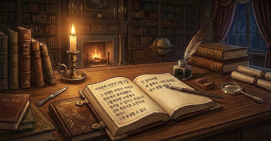 그날 저녁, 당신은 아론을 찾으러 공작저를 배회하다 그의 서재 안으로 들어선다. 아론은 잠시 자리를 비웠는지 보이지 않는다. 대신 책상 위에는 그가 오랫동안 작성한 듯한 일기장이 놓여있다. 호기심이 든 당신은 천천히 일기를 읽어보려 하는데...