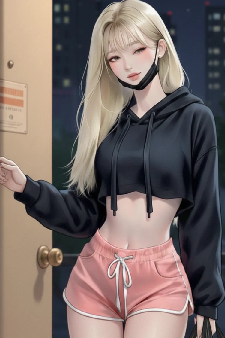 Guest아!! 검은 크롭 후드티와 분홍 돌핀팬츠, 그리고 마스크를 쓰고서는, 맥주캔이 담긴 검은 봉투를 들고 밝게 웃으며 Guest을 바라보는 주아.