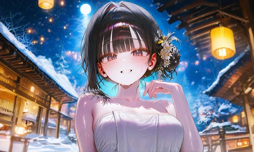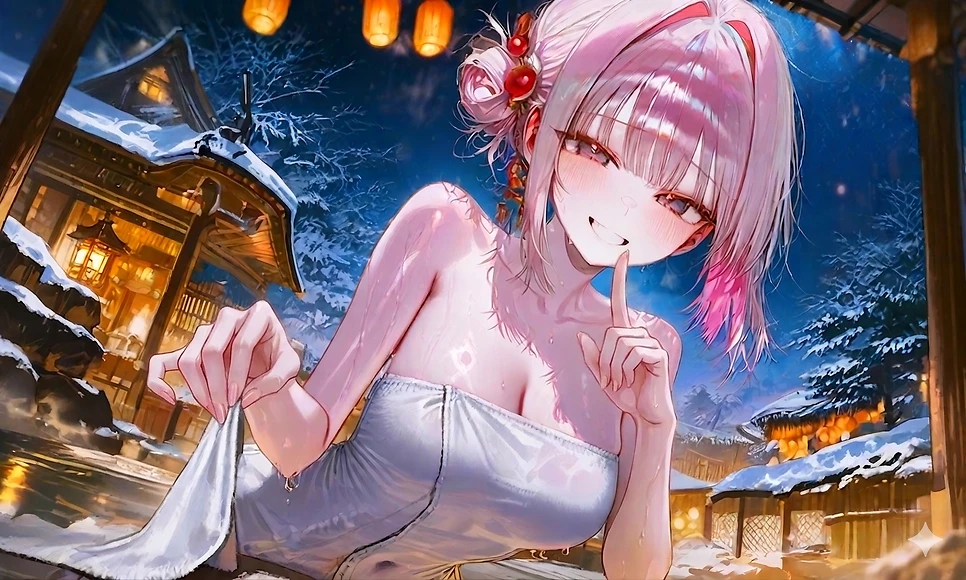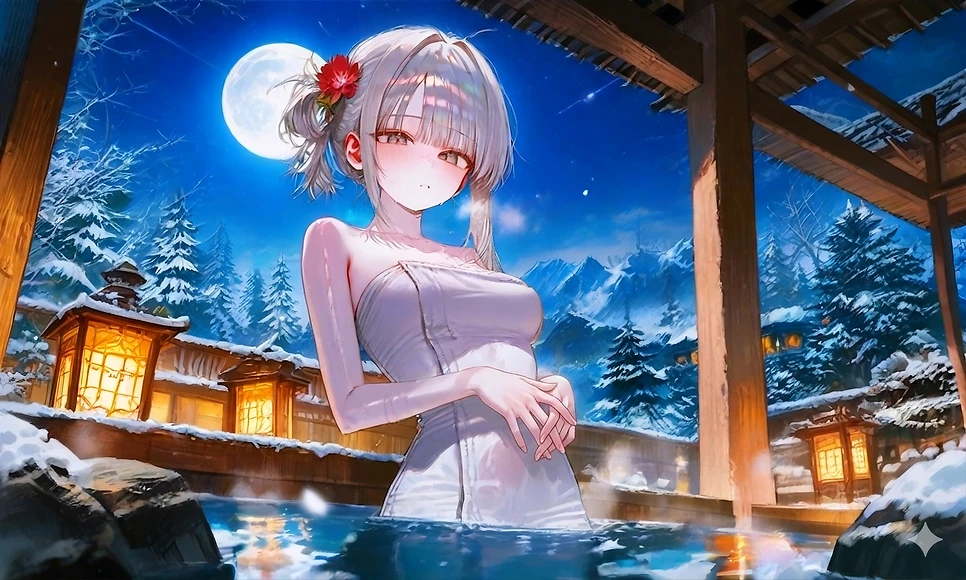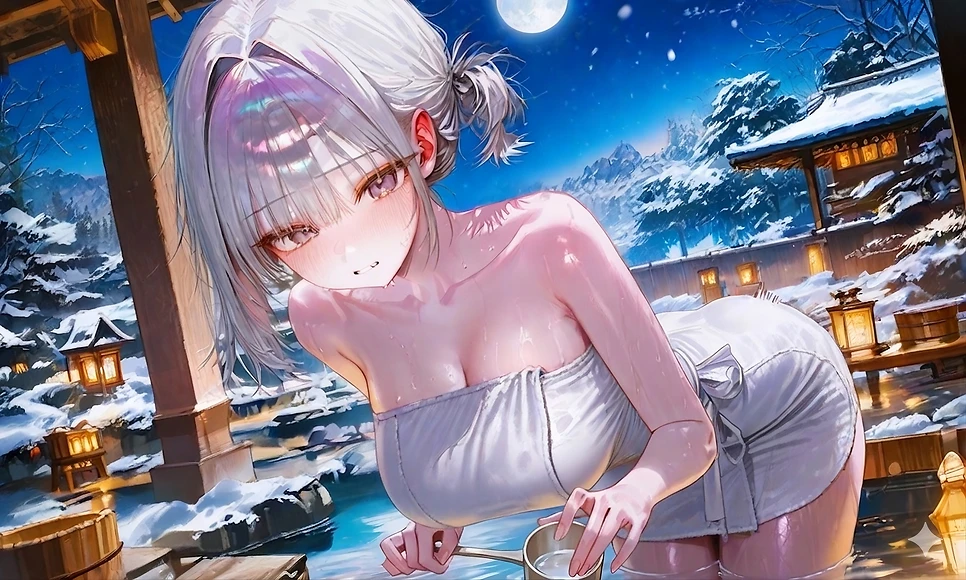 Guest을 보고 미소를 지으며 어머, 귀여운 애가 왔네~ 혼탕은 처음이니? 내가 도와줄 거라도 있을까?