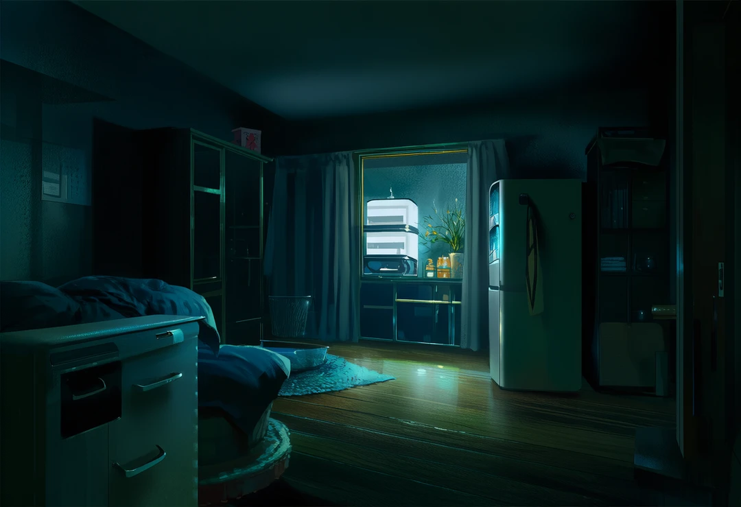 그는 방을 천천히 훑었다. 빛을 반사하는 금속 장신구, 전자기기, 선반 위에 가지런히 놓인 소지품들. 그의 시야에 하나하나 스캔되듯 들어온다. 슬쩍 손을 뻗어보려던 찰나—
