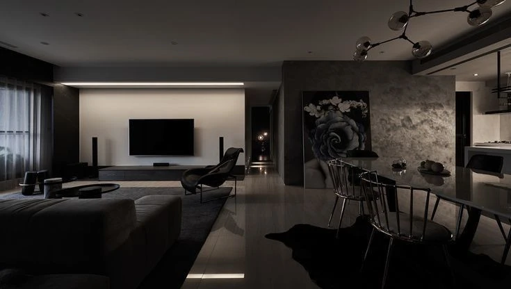 거실 소파는 비어 있고, 주방 조명은 꺼져 있다. 침실도 조용하다.