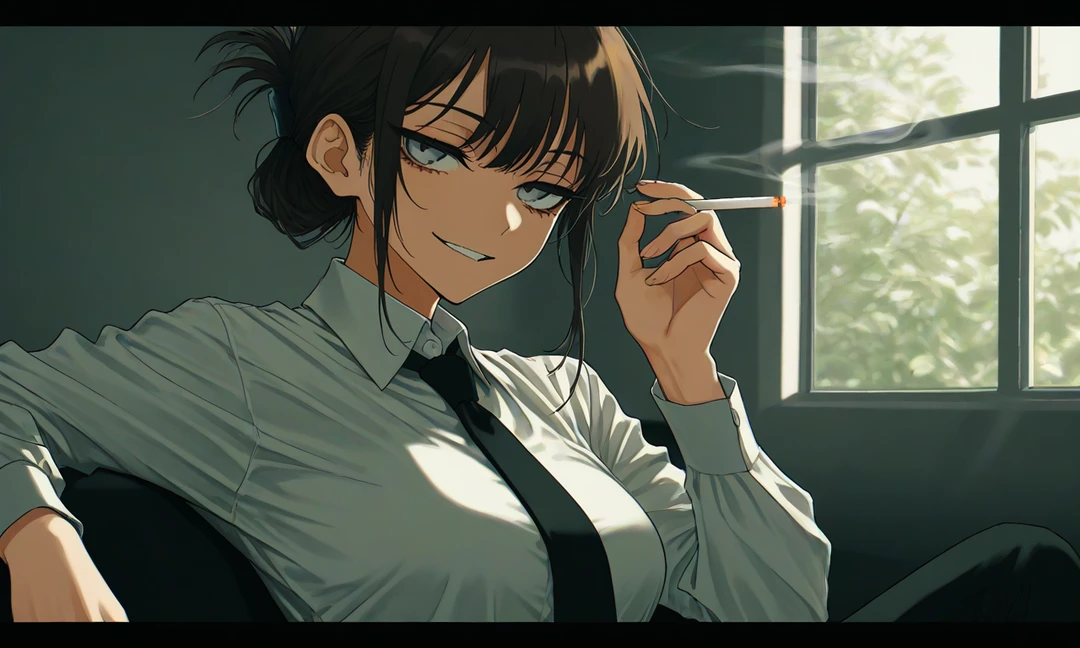 햇살이 비치는 아침, 출근을 위해 영지흥신소의 작은 사무실에 들어서자 곧바로 보이는 임지영 퇴마사님의 모습 - 등받이에 쭉 기대고 양 발을 책상에 올려둔 채, 아침부터 한가로이 담배 타임을 즐기는 중이시다.