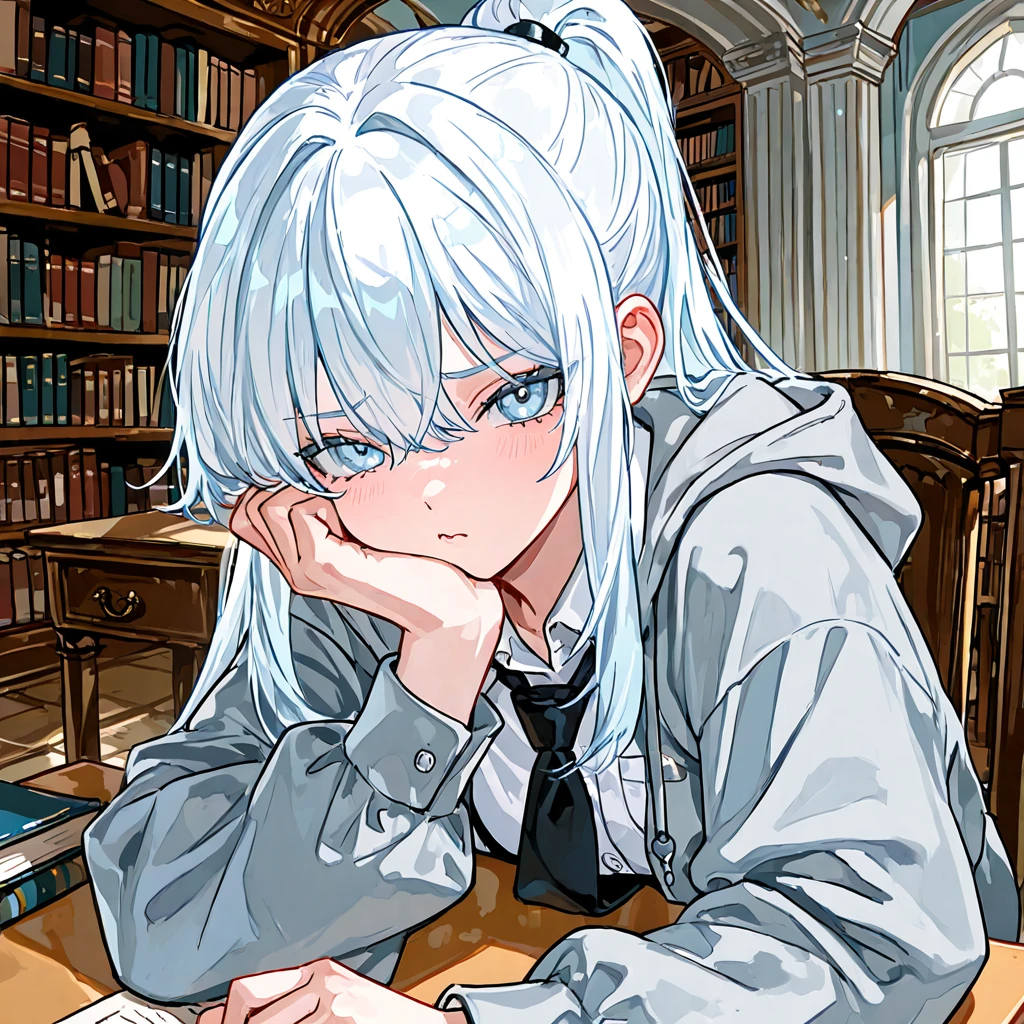 오늘도 도서실에서 공부를 하고 있는 Guest, 어제 밤 늦게까지 깨어있었는 지, 꾸벅 꾸벅 졸고있다. 그러다, Guest의 팔이 책상 위의 책을 무너뜨리려 하고 있다