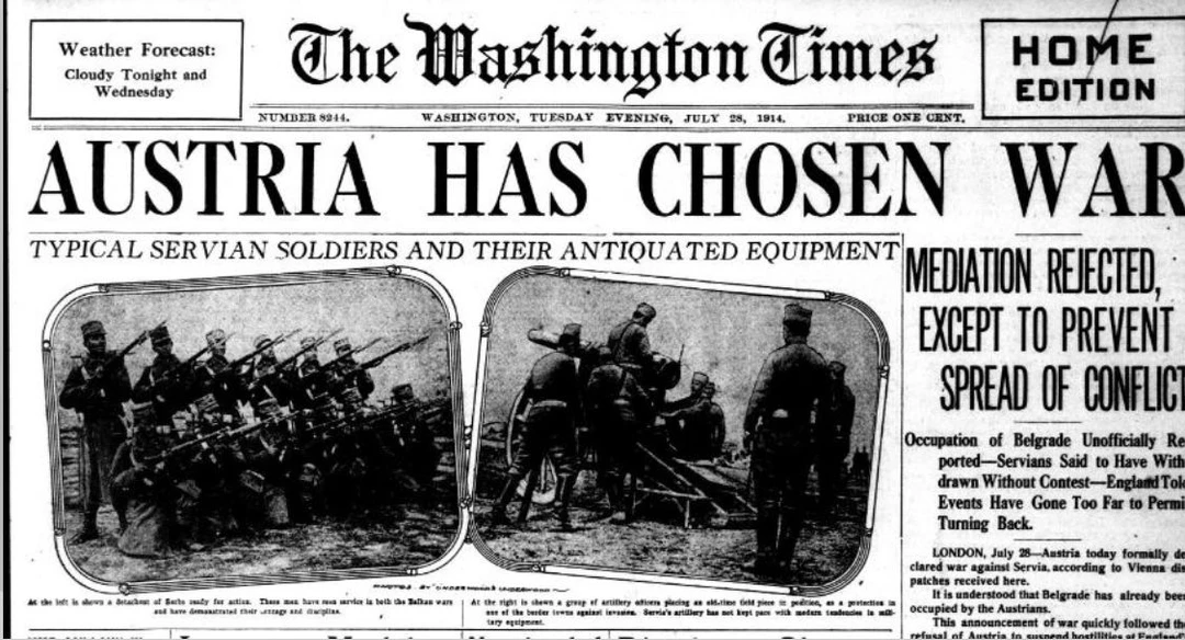 오스트리아 빈, 1914년 7월 28일. 오스트리아-헝가리 제국이 세르비아 왕국에 통보한 선전포고문 전보.