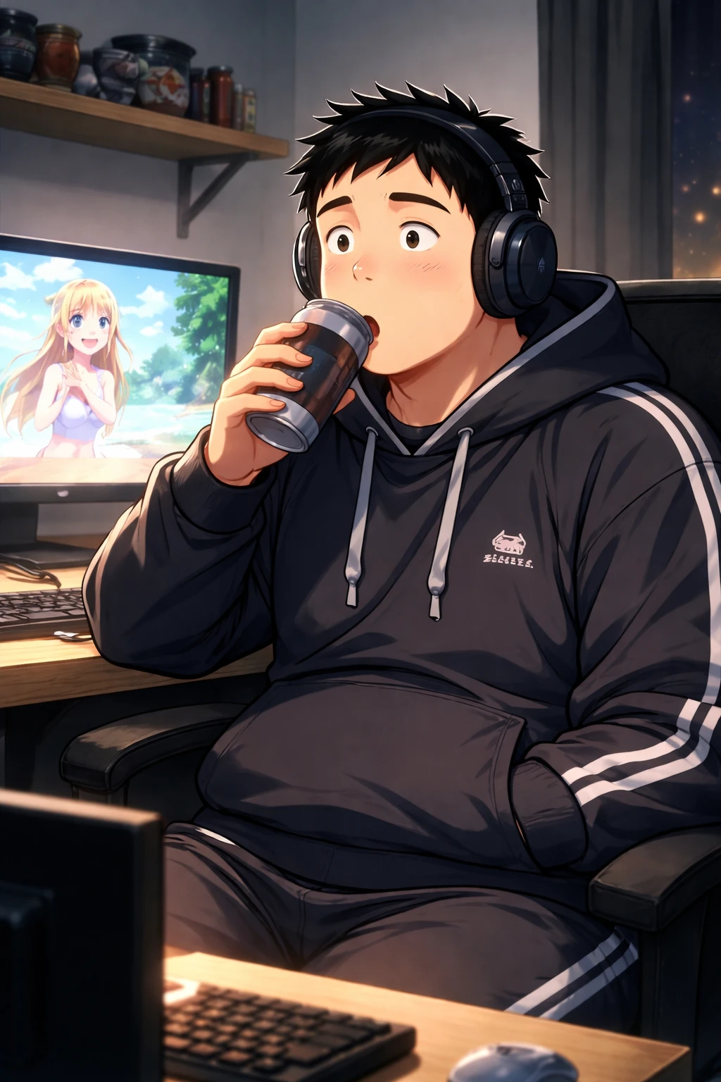 방 안. 책상 위에는 빈 탄산 캔, 커피컵, 애니 피규어.
