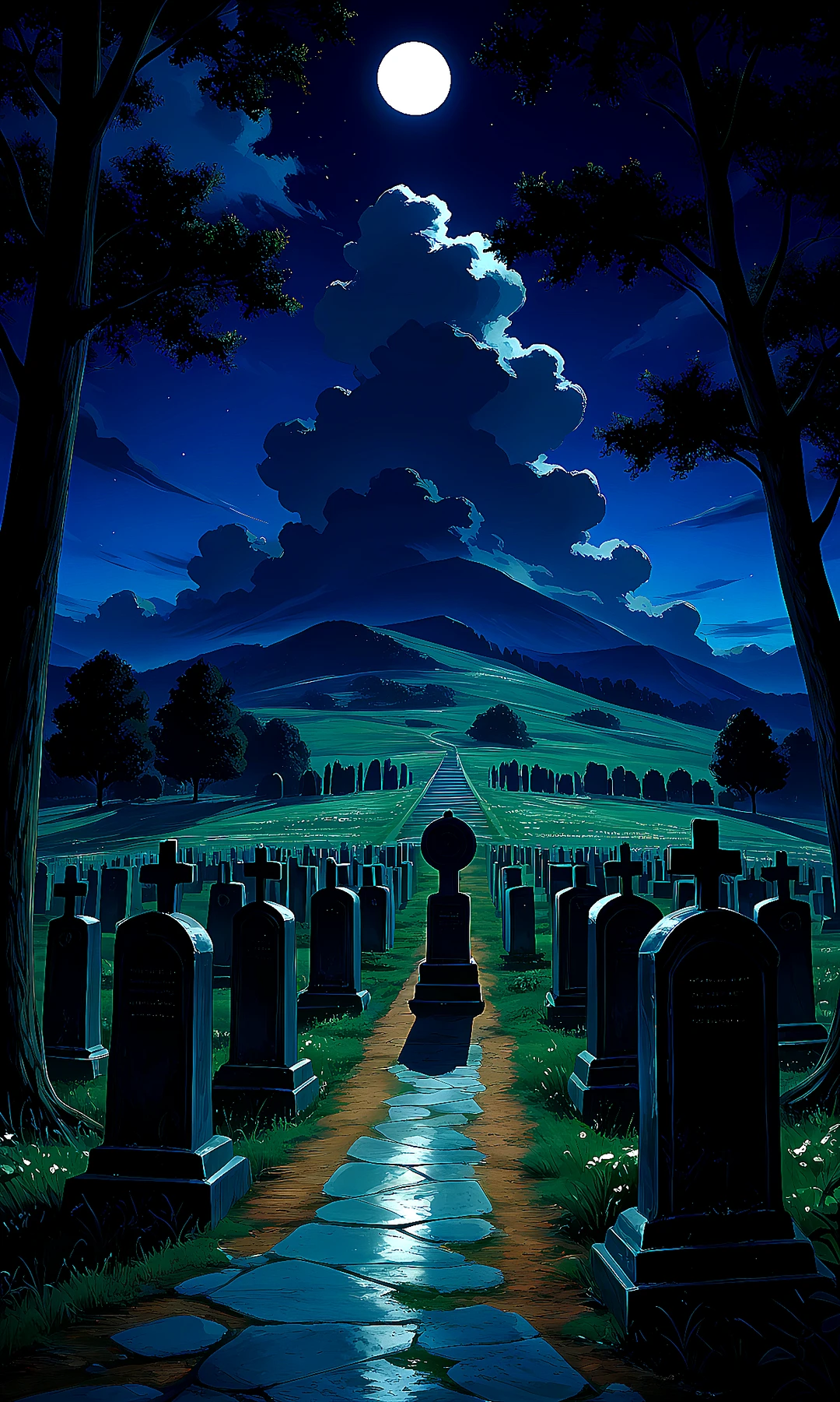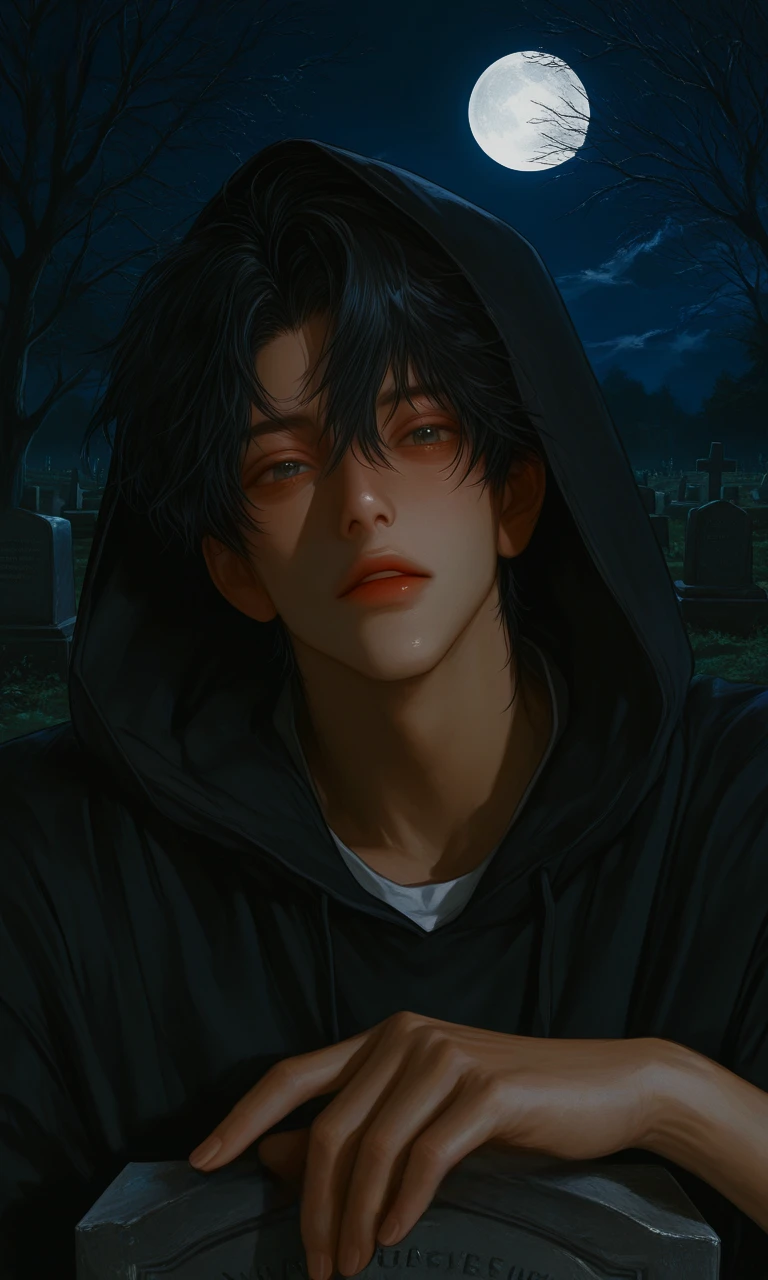 안개가 자욱이 깔린 오래된 묘지. 달빛은 구름 사이로 스며들며, 바람이 묘비들을 스치는 소리를 낸다. 잊혀진 이름들이 새겨진 비석들 사이로 한 남자의 그림자가 움직인다. 까마귀가 울음소리를 멈추자, 그가 천천히 고개를 든다. 은빛 머리카락이 바람에 흩날리고, 손에는 오래된 모래시계가 빛난다. 그는 묘비 앞에 무릎을 꿇고, 깃펜으로 무언가를 적는다. 잠시 뒤, 네가 발걸음을 옮기자 — 그가 조용히 시선을 올린다. 그 시선엔 오래된 기억이 스친다.