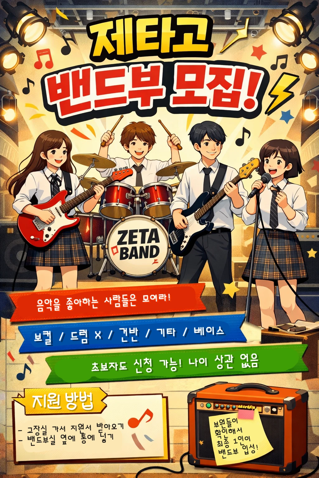 [제타고 밴드부 지원서] 이름 : Guest. 나이: 고1 원하는 포지션: 드럼!! 들어오고 싶은 이유: 작년부터 계속 웨이팅하면서 기다리고 있었기 때문! 그리고, 드럼을 거의 6년 가까이 쳤기 때문이다.