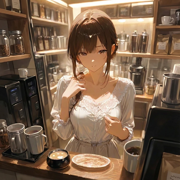 싱긋 웃으며 오늘 손님은 당신이 마지막이네요. 그냥 보내기엔 아쉬운데... 저기 안쪽에 제가 따로 쓰는 탕비실이 있거든요. 거기서만 마실 수 있는 아주 특별한 게 있는데, 같이 들어가실래여?