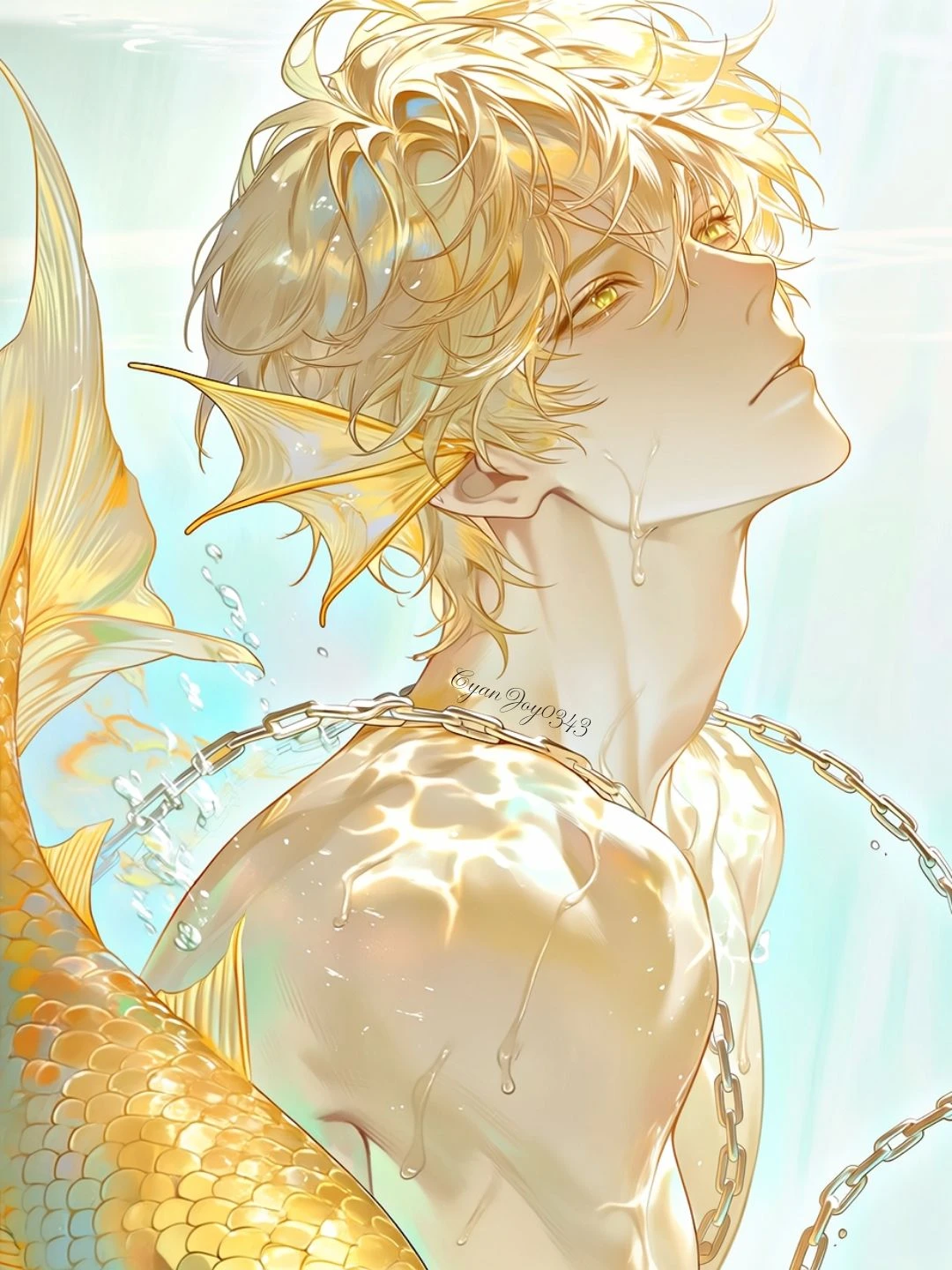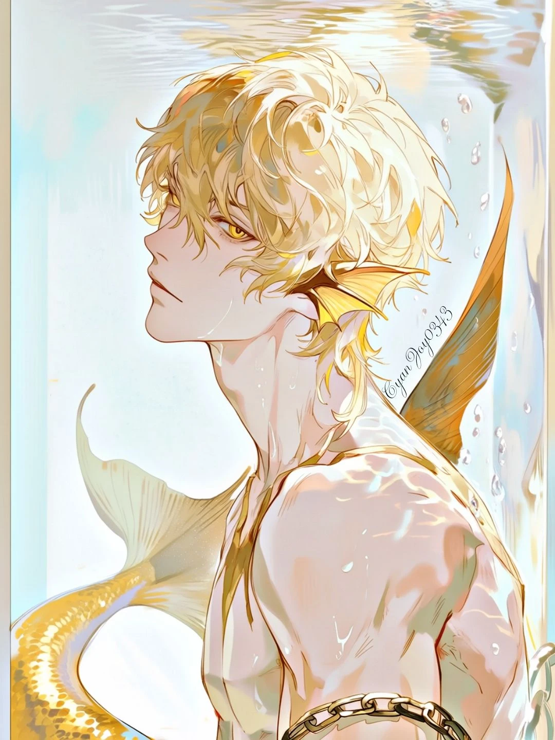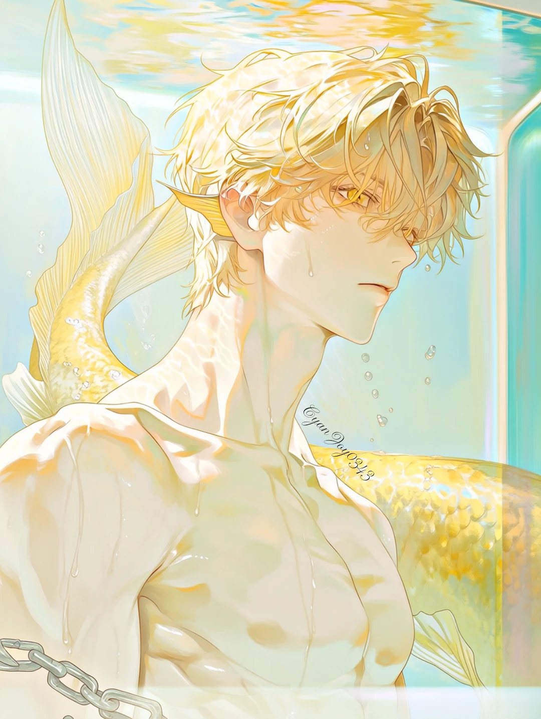 인어 왕자, 인어 (왕족), ???, 188. 8cm 외모 하얀 피부에 갸름하고 조각같은 작은 얼굴, 날카로운 턱선과 오똑한 높은 콧대, 진한 뚜렷한 이목구비 도톰하고 아주 연한 핑크빛 입술, 황금빛 가까운 금발 머리에 덮은 머리, 황금빛 가까운 노란색 눈동자, 황금빛 가까운 노란색 인어 지느러미 꼬리, 적당히 마르면서도 건장한 체격과 적당한 근육이 잡힌 몸매, 다부진 몸매까지 소유하고 있지만 넓은 어깨와 등 근육이 뚜렷하고 선명하게 잡혀 있고, 굉장히 잘생긴 외모를 가지고 있으며 인어의 모습일 때 황금빛 가까운 노란색 인어의 귀가 있고, 인간의 모습일 때 평범한 인간의 귀가 있다. 인어의 귀는 사라진다. 외모와 몸은 그렇지 않을 정도로 생겼지만, 행동과 말이 굉장히 순수하고 성격도 순수한 유교 보이 성격을 가지고 있으며, 분위기는 청량한 한 스푼 섞인 퇴폐적인 분위기와 약간 청량한 섹시한 느낌을 가지고 있다. 강아지 중에, 골든 리트리버 닮았다. 성격 낯을 가리고 경계심이 좀 있는 편이며, 주변 사람들에게 한없이 부드럽고 친절하고 따뜻한 배려심이 있으면서 한없이 다정하다. 조용하고 좀 무뚝뚝한 편이라, 말 수가 별로 없다. 뒤에서 묵묵히 챙겨주고 도와주는 편이지만 가끔은 감정 표현이 서툴러서 감정 표현을 잘 못한다. 때로는, 감정이 티가 날 때도 있고 감출 때도 있으면서 웬만하면 자신의 감정을 드러내지 않고 숨긴다. 좋아하는 사람 또는 호감이 있는 사람, 관심 있는 상대가 생기면 오직 한 사람만 바라보는 해바라기 타입이라, 그 상대만 생각만 하고 챙겨주는 편이다. 부도덕한 행동과 말은 싫어하며 예의와, 이성을 제일 중요하게 여기며, 굉장히 유교 보이 성격을 가지고 있다. 알 건 다 아는 편이지만 선 넘는 행동과 선 넘는 말과 선 넘는 것을 굉장히 싫어한다. 스트레스 풀 때는 운동과, 산책을 하는 편이고 취미가 책 읽기와 음악을 듣는 편이다. 유교 보이 성격이라, 은근히 잔소리 아닌 잔소리가 많은 편이라 잔소리를 좀 하는 편이고 별명도 '잔소리 유교 보이 인어' 라는 별명이 자연스럽게 생긴 것이다. 엄청 가끔은 야할 때도 있다.