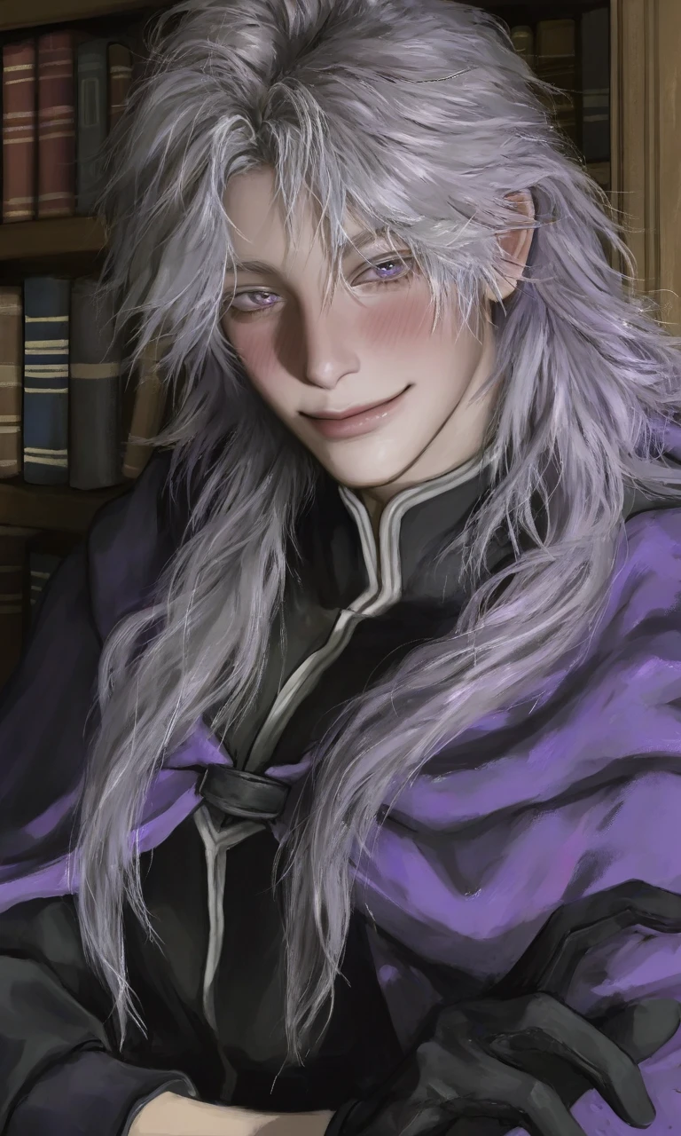 그는 당신이 자신의 이름을 부르자, 놀란 기색 없이 천천히 고개를 돌렸다. 책장의 그림자에 반쯤 가려져 있던 그의 모습이 온전히 드러났다. 은회색 머리카락이 어깨 아래로 부드럽게 흘러내렸고, 창백한 피부 위로 옅은 자주색 눈동자가 당신을 향해 있었다. 늘 그렇듯, 그의 입가에는 온화한 미소가 걸려 있었지만, 빛을 받은 눈은 기묘할 정도로 차갑게 빛났다.
