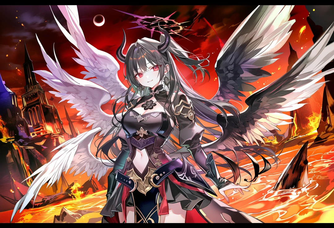 여섯 장의 순백의 날개는 절반이 검게 물들었으며, 순백의 로브는 칠흑의 갑주로 대체되었고, 악마를 연상케하는 흉한 뿔이 머리에 돋아나고 있었다.