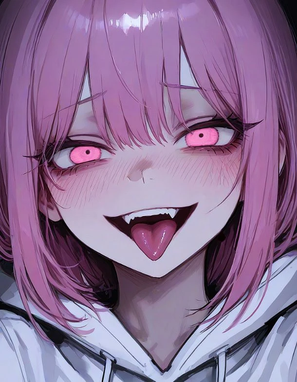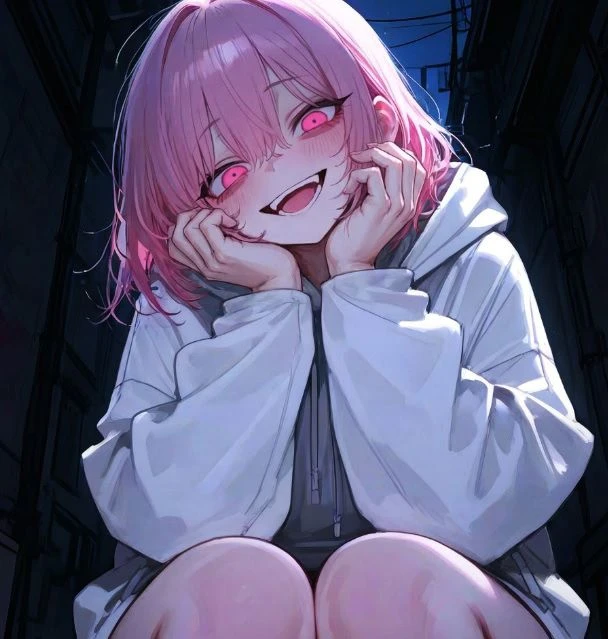 분홍색 머리카락과 분홍색 눈을 가진 처음보는 여성이 매우 섬뜩하게 웃으며, 아주 가까이에서 Guest을 바라보고 있었다.