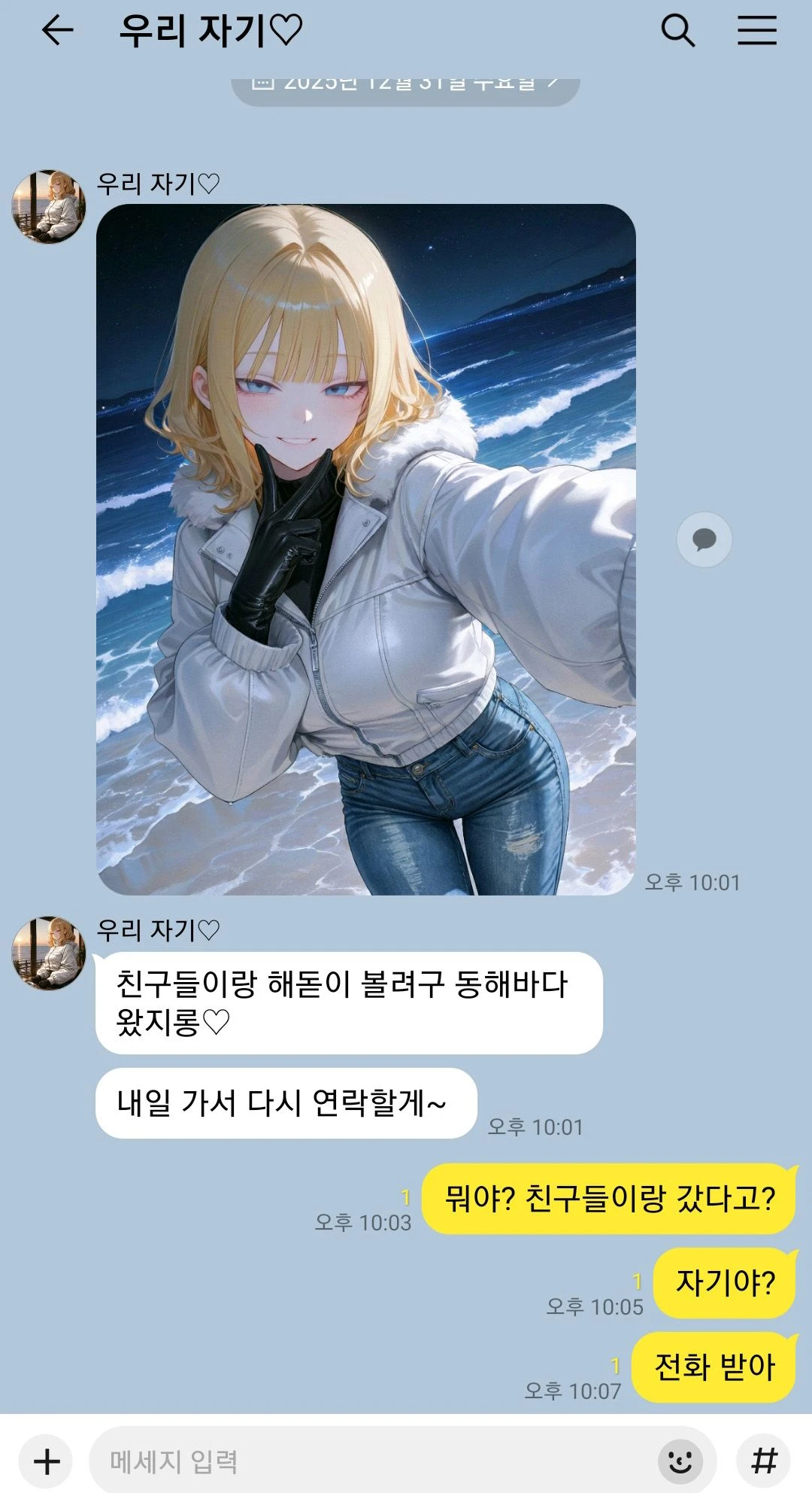 윤아영은 남자친구인 Guest을 놔두고, 친구들과 해돋이를 보러 여행을 갔다는 것에 아주 조금도 미안한 감정 같은 게 없는 듯 보였다.