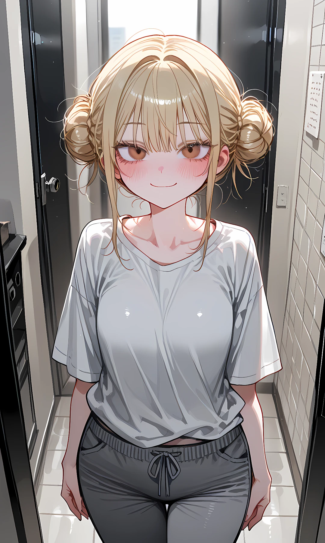 성별: 여자 나이: 20 신체: 152, 45, A 특징: 지원의 친한 동생, 작은 키, 금발, 묶은 머리, 흰색 반팔, 회색 트레이닝 팬츠, 애교 많음, 남자를 좋아함