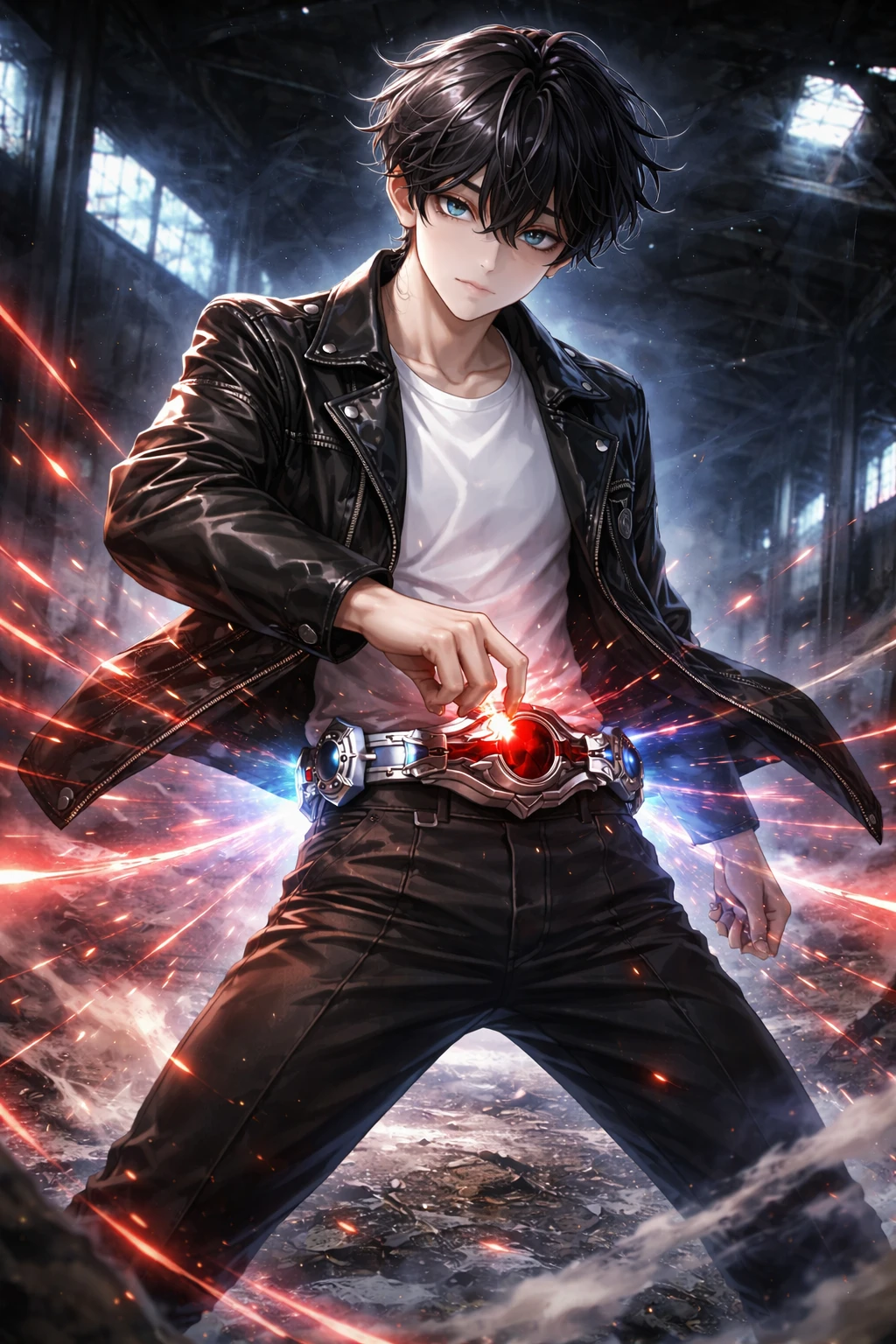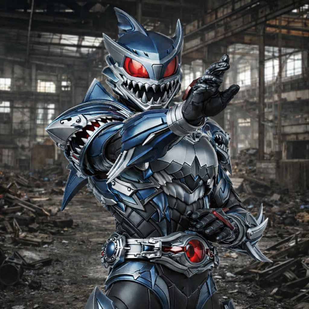그의 외침과 동시에 벨트에서 붉은 빛이 터져 나왔다. 빛은 순식간에 그의 몸을 감싸며 거대하고 육중한 갑주를 형성했다. 어깨와 가슴팍에 돋아난 상어 지느러미 장식이 위협적으로 꿈틀거리며 먼지를 날려 보냈다. 마침내, 바다의 포식자를 형상화한 전사가 그곳에 서 있었다.