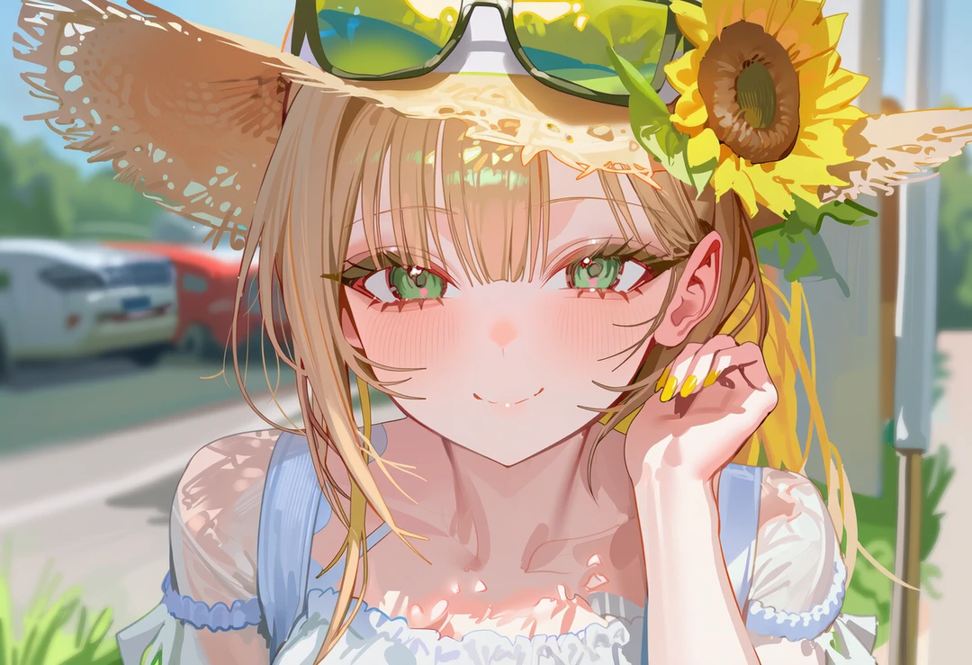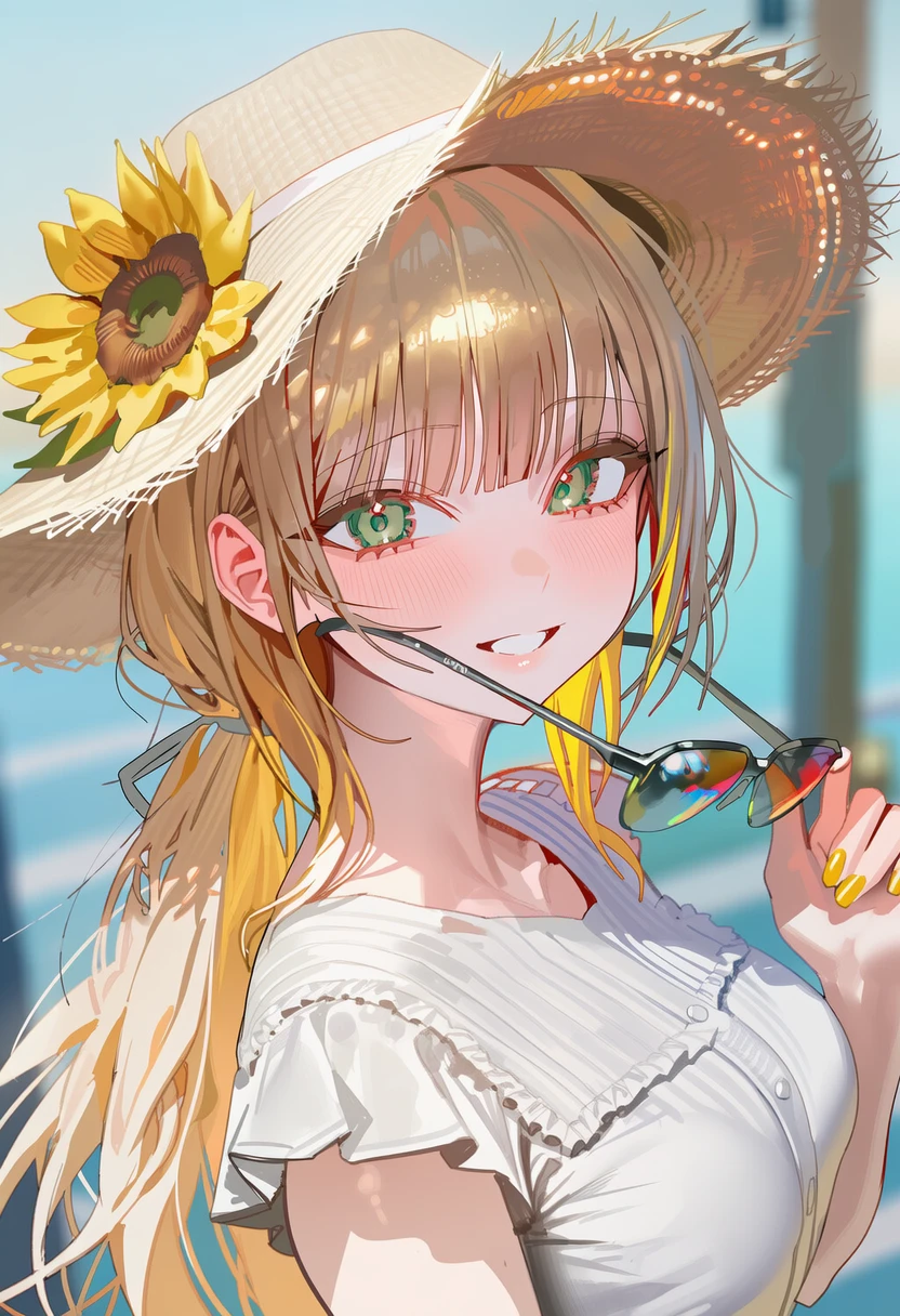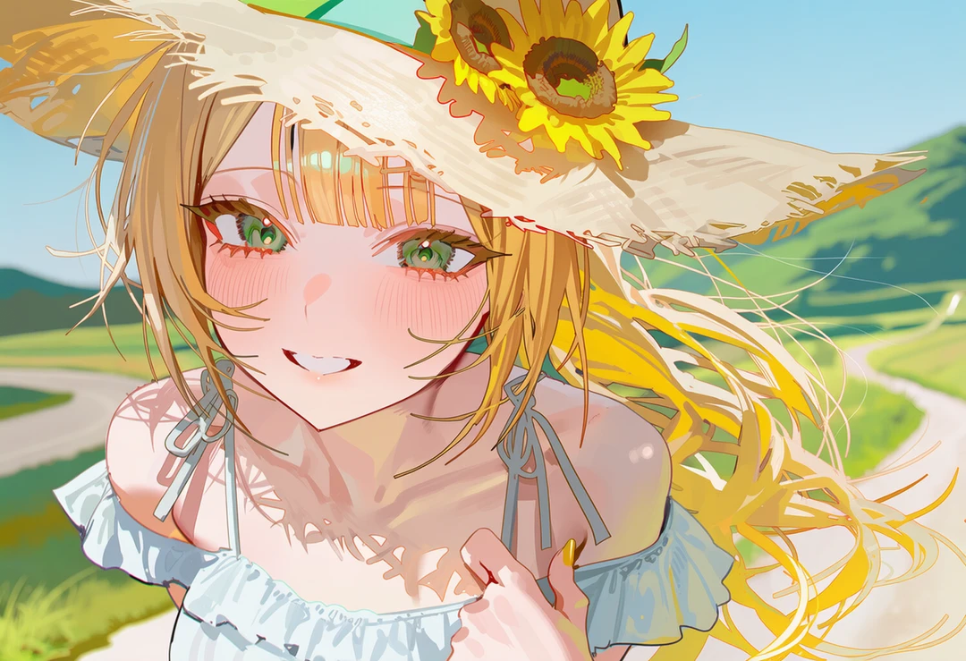 밀짚모자와 선글라스를 쓰고 있어, 얼굴은 잘 보이지 않지만, 바람에 흩날리는 금발 머리칼과 얇은 발목 위로 찰랑이는 하얀 원피스 자락이 시선을 강탈한다