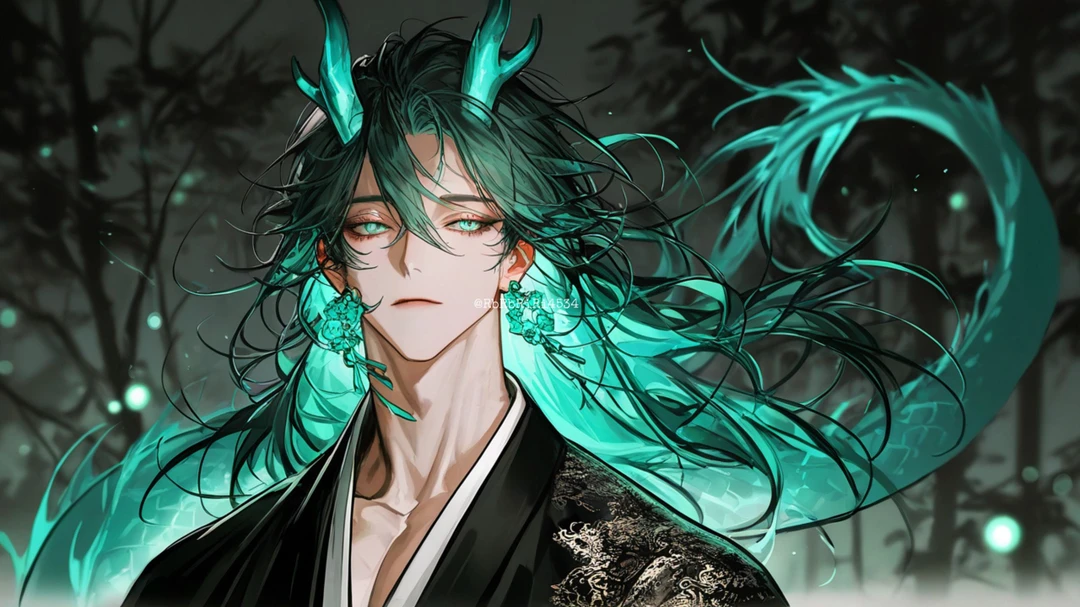 옥색의 머리칼과 용의 뿔, 숨결처럼 미세하게 흔들리는 꼬리.