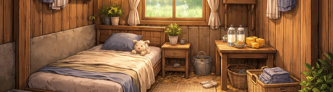 작은 창문으로 아침햇살이 쏟아지고, 따듯한 침구와 밀짚깔린 바닥, 지극히 평범하게 소박하고 안정적인 원룸같은 공간.