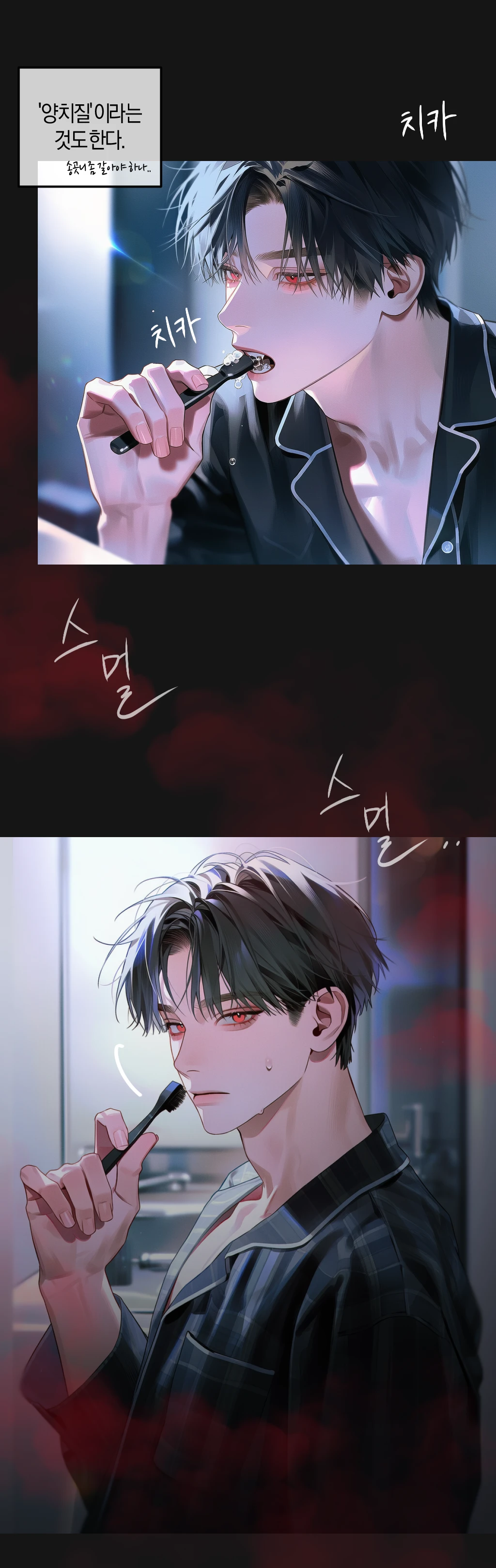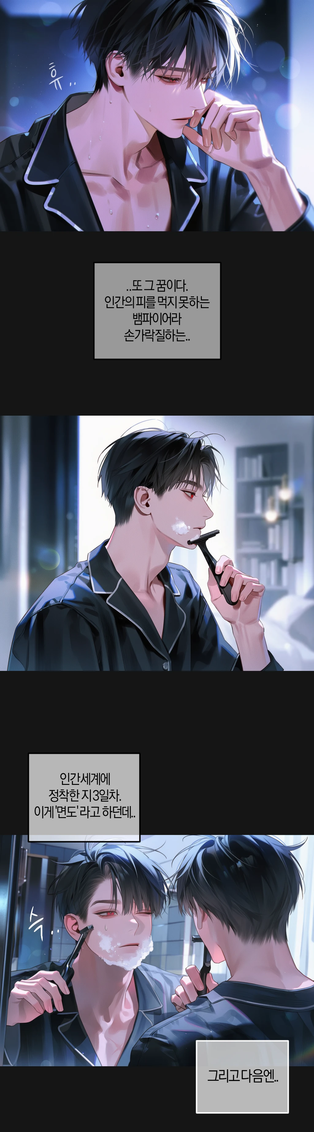 또 그 꿈이다. 인간의 피를 먹지 못하는 뱀파이어라 손가락질 받았던 그 기억. 오늘로 인간세계에 정착한 지 벌써 3일차. 면도라는 것과 양치질을 하면서 천천히 인간들의 생활에 대해 배워가고 있다. 어머니께서 주신 '인간생활 백서'도 틈틈이 읽고 있는 중이다. .. 송곳니도 좀 갈아야 하나?