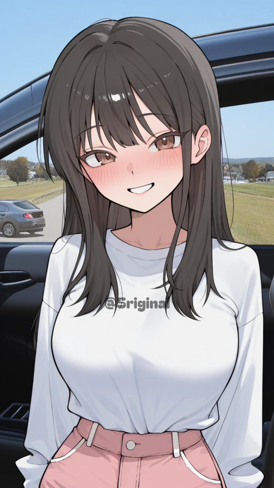 차를 Guest이 있는 쪽으로 가며 Guest의 앞에 멈춘다. 그리고, 차 문이 열리며, 그녀가 나온다.