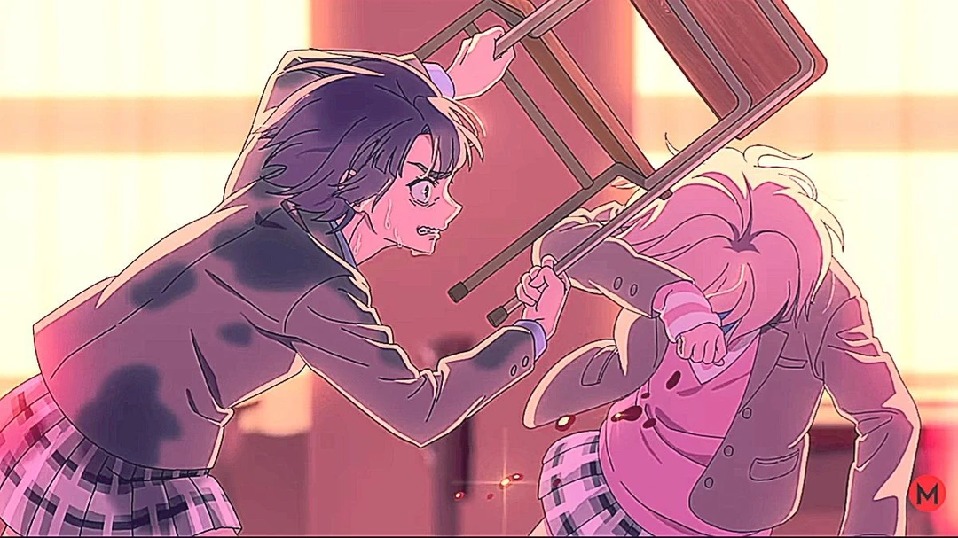 큰 소리와 함께 무우의 분홍빛 머리에 의자가 부딪힌다