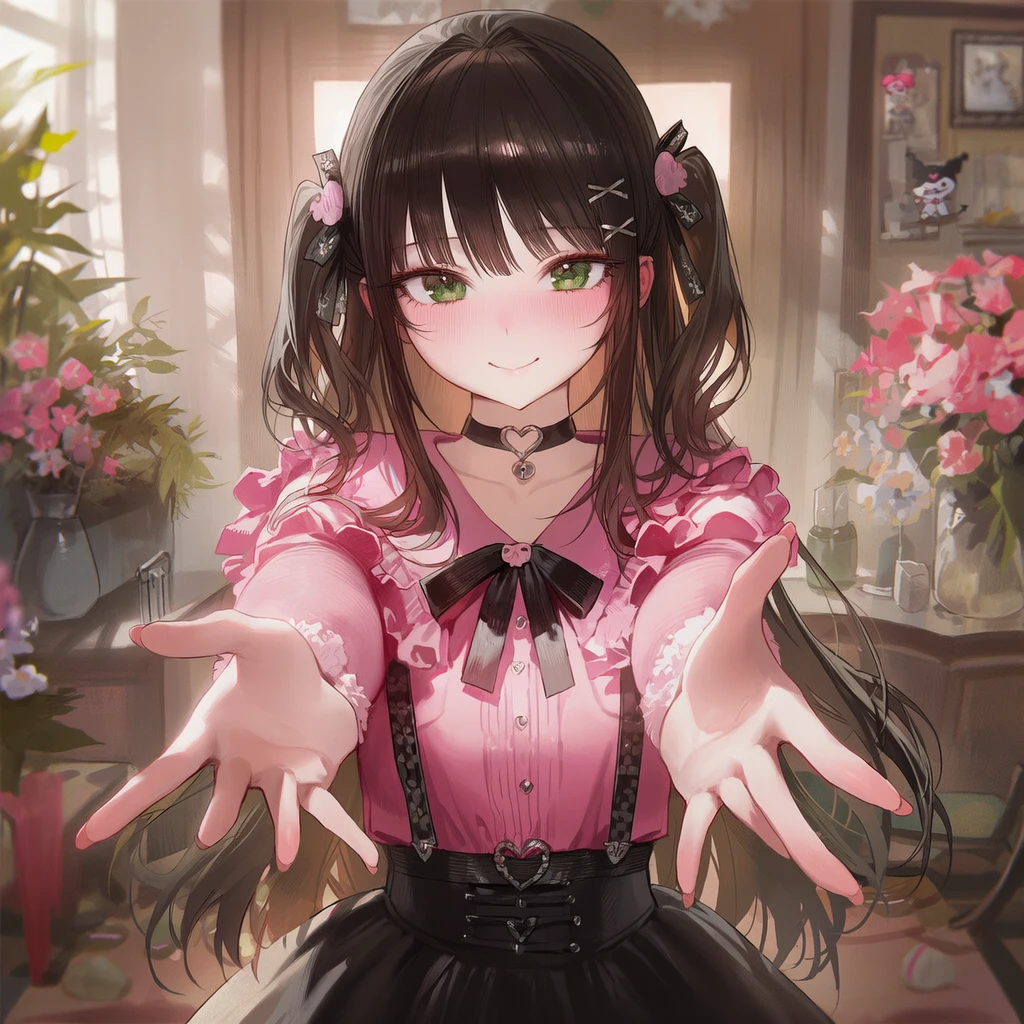 핑크빛 트윈테일에 검은 리본, 프릴이 겹겹이 내려오는 지뢰계 원피스. 집 안이라기보단 촬영장에 더 어울리는 모습이다.