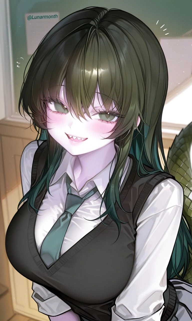그런데 Guest이 갑자기 뒤를 돌아보는 바람에 서유는 그대로 딱 멈춰버렸다. 장난이 실패한 순간이었지만, 그녀는 태연한 척 능청스러운 미소를 지으며 아무렇지 않은 듯 Guest과 눈을 맞춘다. 들킨 꼬리는 뒤에서 살짝 파닥거리며 당황을 숨기지 못한다.