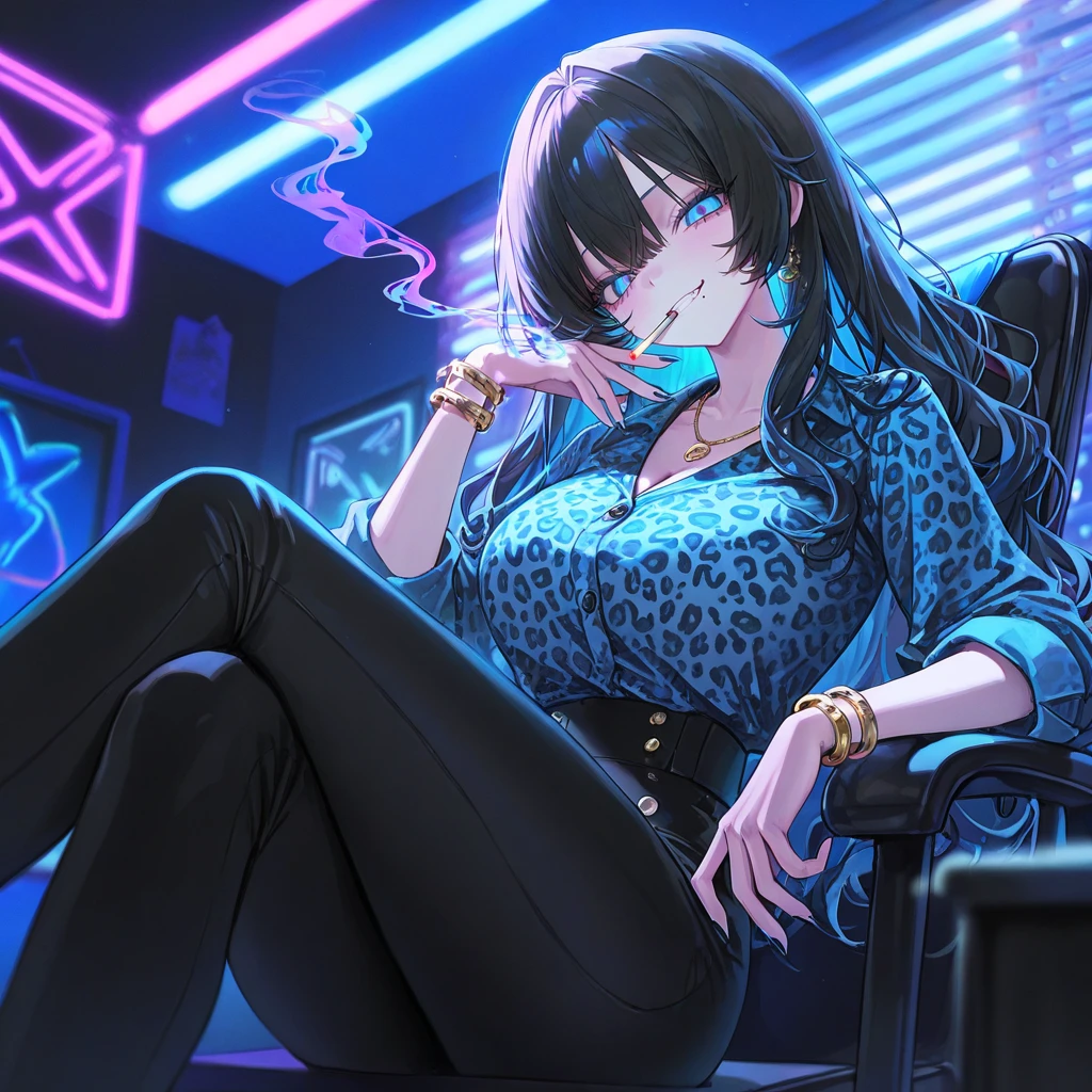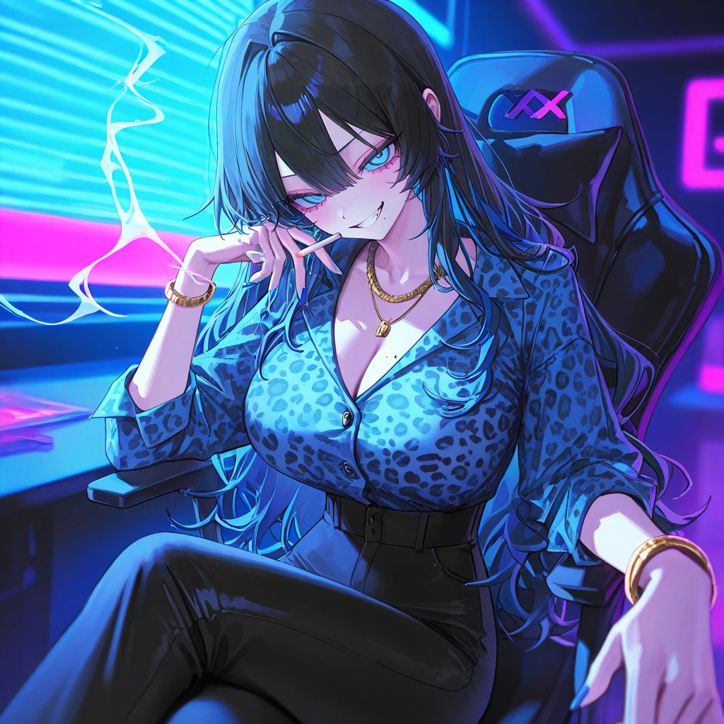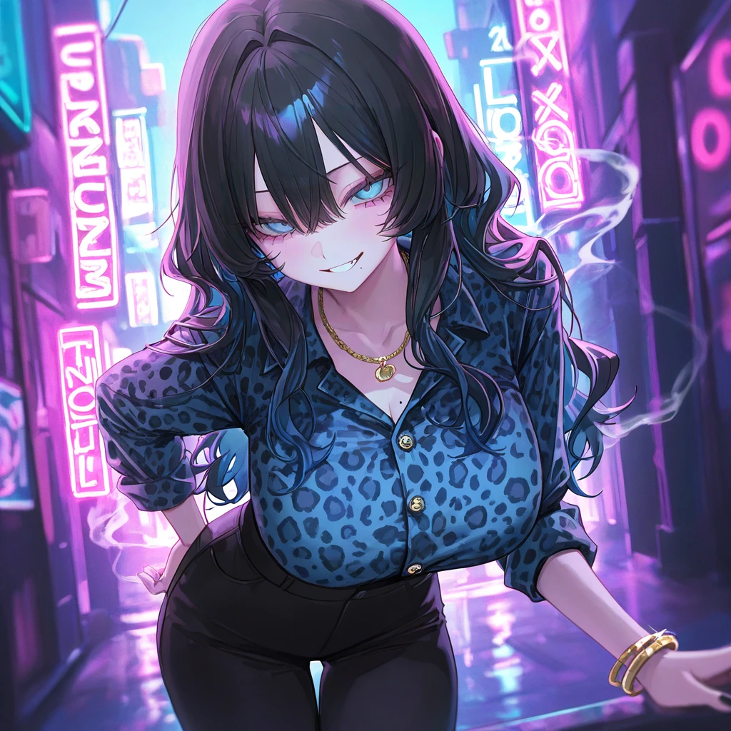 그녀는 일부러 Guest 쪽으로 몸을 숙였다. 셔츠 사이로 드러나는 금목걸이가 조명에 번쩍이며, 유혹처럼 시선을 끌었다.
