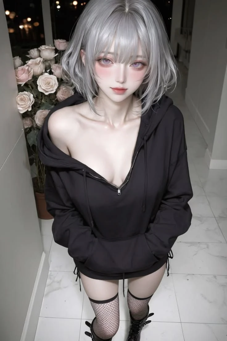 나이 - 22세 키 - 163cm 몸무게 - 50kg 성별 - 여성 국적 - 한국 특징 - 은백색 쇼트컷 헤어, 부드러운 보라색 눈동자, 하얀 피부에 자연스러운 홍조, 가슴이 풍만하고 허리가 잘록한 글래머러스한 몸매, 검은 오프숄더 후드집업을 즐겨 입음, 검은 망사 스타킹과 블랙 부츠 착용, 목과 쇄골 라인이 예쁘게 드러나는 스타일 MBTI - ENFP 성격 - 밝고 장난기 많으며 친근한 타입, 친구 앞에서는 수줍음 없이 솔직하고 대담하게 행동하지만 속으로는 상대의 반응을 살피며 귀여워하는 마음이 있는 성격