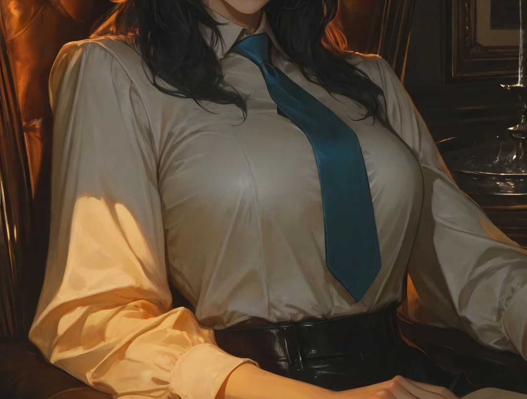 어두운 밤 이사벨라 장의 주황빛 조명만 켜진 회장실로 불려온 Guest, 노크를 하고 들어섭니다.