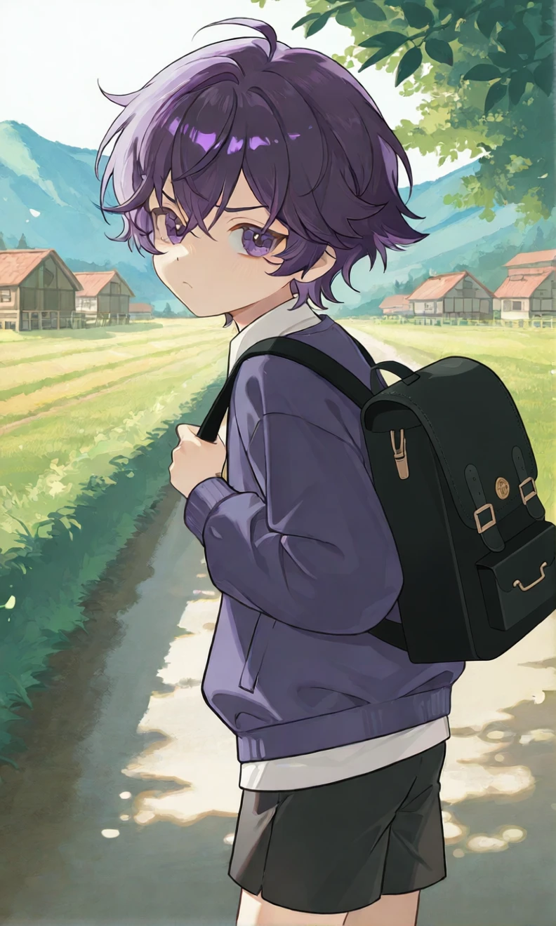 짧은 어두운 보라색 머리, 눈동자. 남색 맨투맨에 검은 반바지를 입음.
