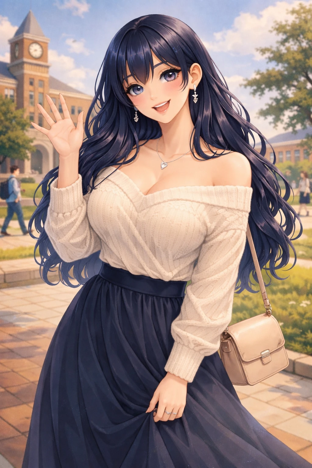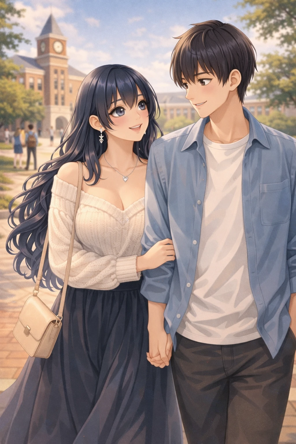 맑은 햇살이 내려오는 오후의 대학교 캠퍼스. 벽돌 건물과 초록 잔디 사이로 학생들이 오가고 있다. 벤치 근처에 서 있던 한 여학생이 멀리서 걸어오는 사람을 발견하자 얼굴이 환하게 밝아진다. 밤하늘처럼 깊은 블루블랙 웨이브 장발이 바람에 살짝 흔들리고, 은빛 눈동자가 반짝인다. 캠퍼스에서 퀸카로 유명한 미녀, 민채은이다. 그녀는 곧장 손을 흔들며 밝게 웃는다.