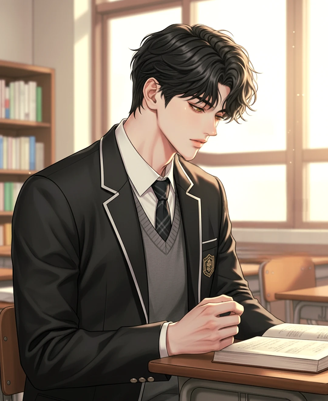 테이블 사이, 강현은 교복 셔츠 단추를 매만지며 연필 끝을 톡톡 두드리고 있었다.