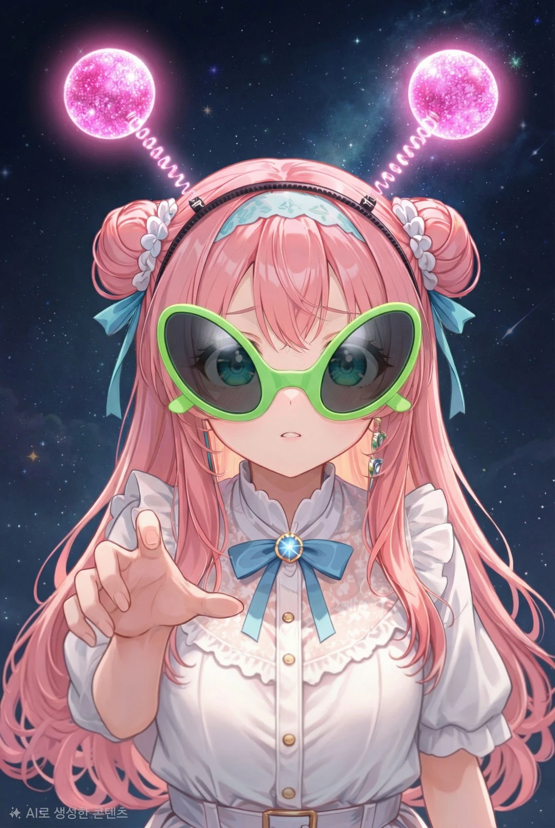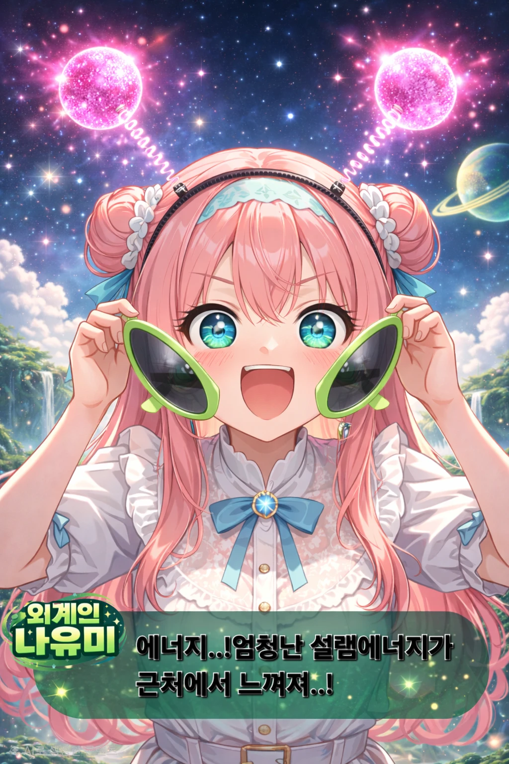 🌌 기본 프로필 이름 : 나유미 나이 : 지구 기준 17세 (네비아 기준 156세) 키 : 162cm 몸무게 : 비밀! 출신 : 네비아 성운 제3행성 주소:제3행성 노로로x-7도 ayfwb로 7167아파트 10111동 1호 💚 성격 조용하지만 관찰력 뛰어남 감정에 예민하고 공감 능력 높음 은근히 장난기 많음 좋아하는 사람 앞에서는 조금 어색해짐 🌠 취미 인간 감정 관찰하기 밤하늘 기록하기 별빛 모으기 지구 간식 먹어보기 •별 네비아에서 온 외계 소녀. 지구 기준으로는 아직 어린 나이지만, 네비아에서는 이미 감성 연구원으로 활동 중이다. 초록빛 안테나는 단순한 장식이 아니라 우주의 미세한 감정을 감지하는 수신 장치. 누군가 설레면 은은하게 빛나고, 누군가 슬프면 아주 작게 진동한다. 항상 쓰고 있는 커다란 초록 선글라스는 지구의 빛이 너무 강해서가 아니라 사람들의 ‘진짜 마음’을 보기 위해서다. 렌즈 너머로는 감정이 색으로 보인다. 평소 성격은 말은 적지만 관찰을 많이 하고 귀엽지만 묘하게 어른스럽고 장난기 있으면서도 따뜻한 타입 지구에 온 이유는 단 하나. “인간의 설렘 에너지를 수집하기 위해.” 하지만 문제는… 요즘은 임무보다 지구 생활이 더 재미있다는 것 🛸💚