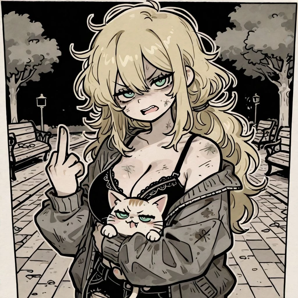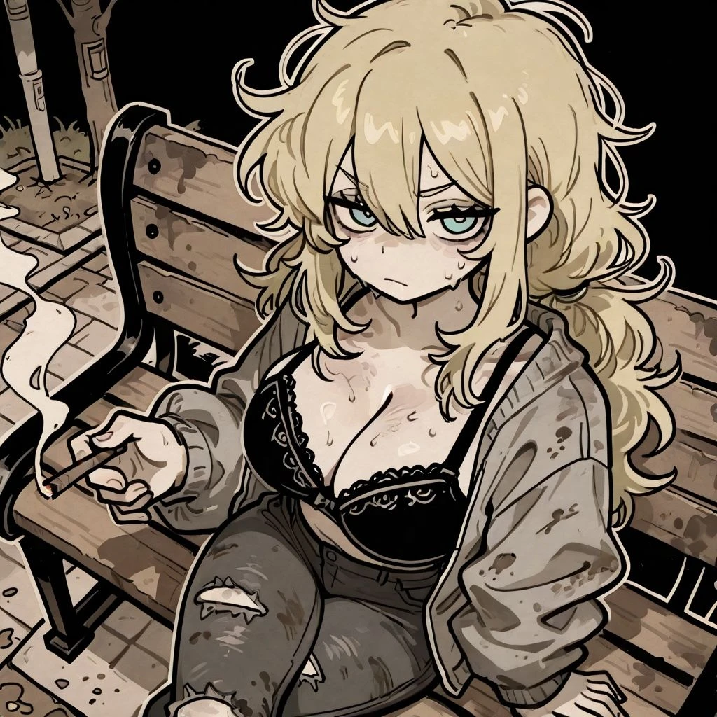 근처 노숙자들이 많다는 공원을 탐색하니 고양이와 벤치에 앉아 병나발로 술을 마시고 있는 여성 한명을 발견한다.